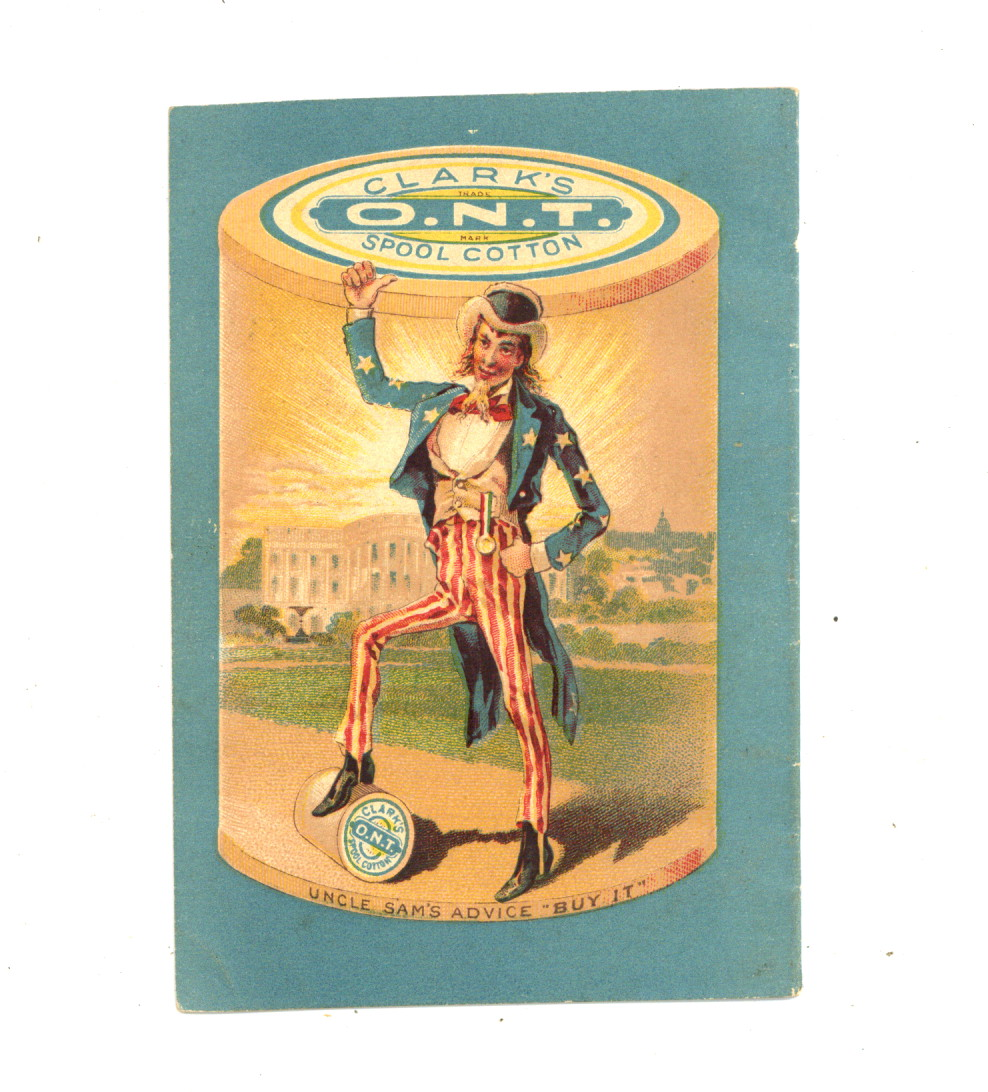 Published 1890 (est.) by Clark Thread Co..$156.00Advertising booklet for Clark's O.N.T. Spool Cotton, estimated 1890s. 12 pages, 3" x 4.5", color cover with sepia tone interior.