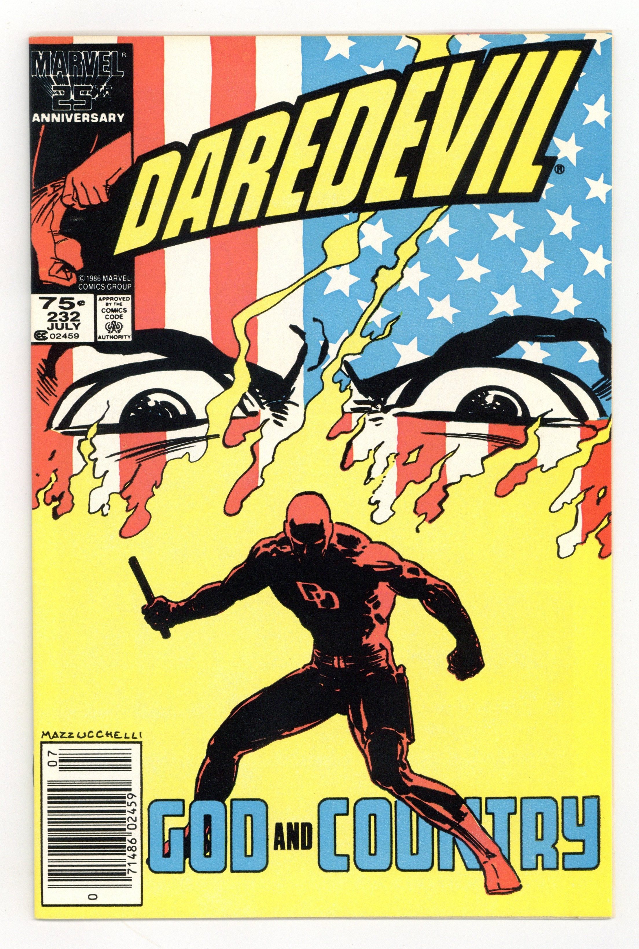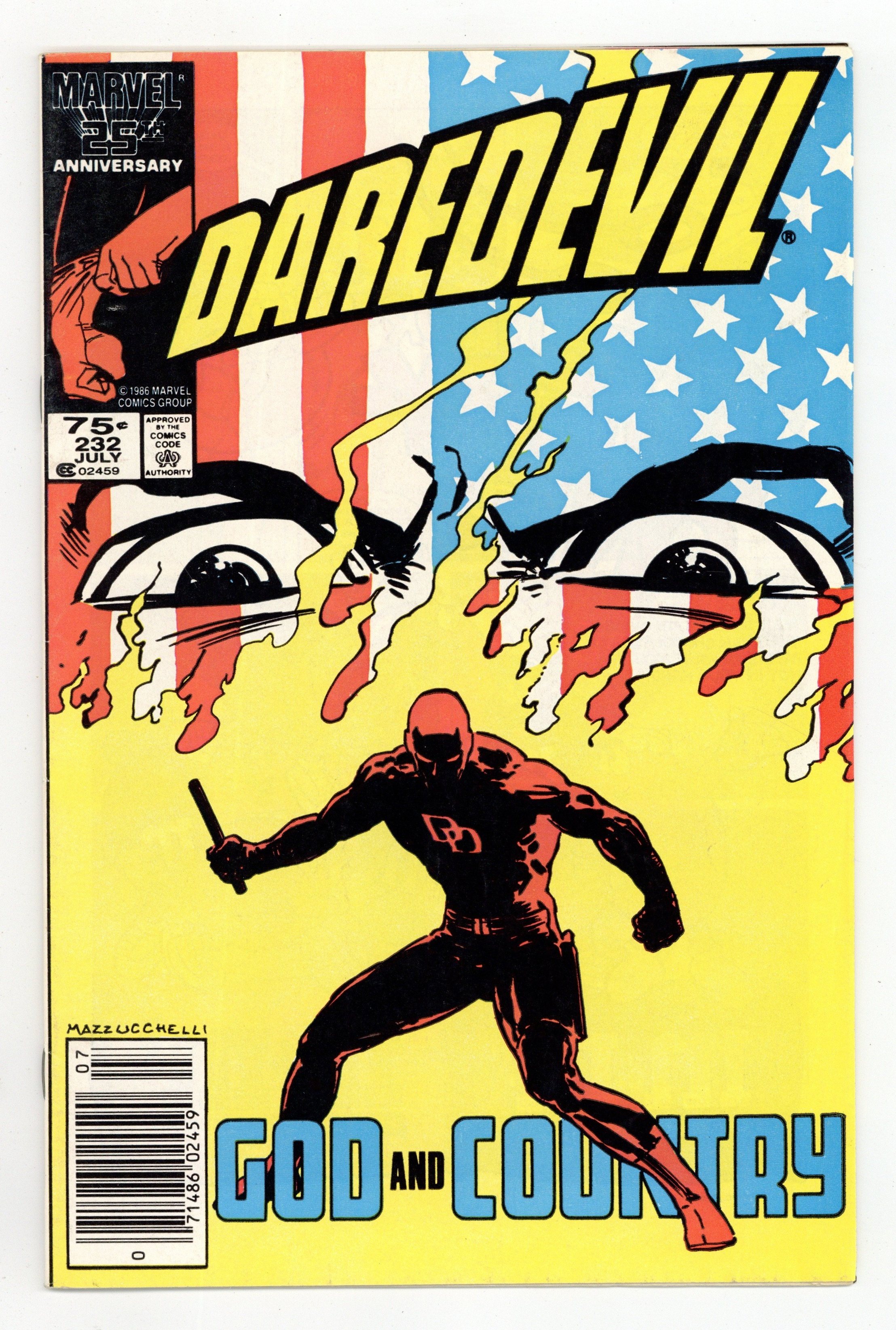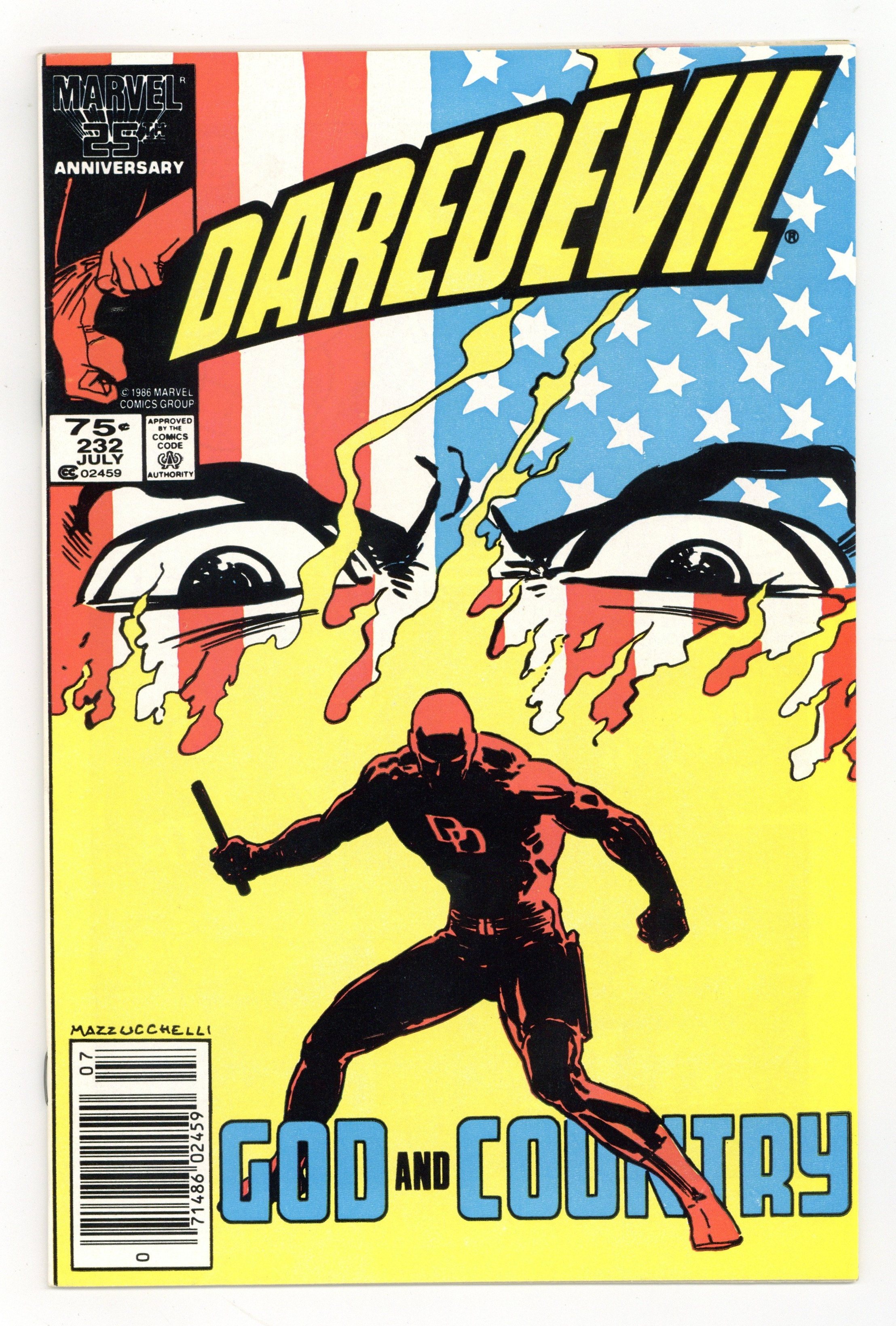 Newsstand Edition. Cover art by David Mazzucchelli. God and Country starring Daredevil, Karen Page, Foggy Nelson, Glorianna O'Breen, Ben Urich, Kingpin, and Nuke [Sgt. Simpson] (1st), script by Frank Miller, art by David Mazzucchelli; Matt helps Karen kick her drug habit; Kingpin hires a deranged Super Soldier to go after DD; part 6 of critically acclaimed Born Again storyline. 36 pgs. Cover price $0.75. Cover price $0.75.