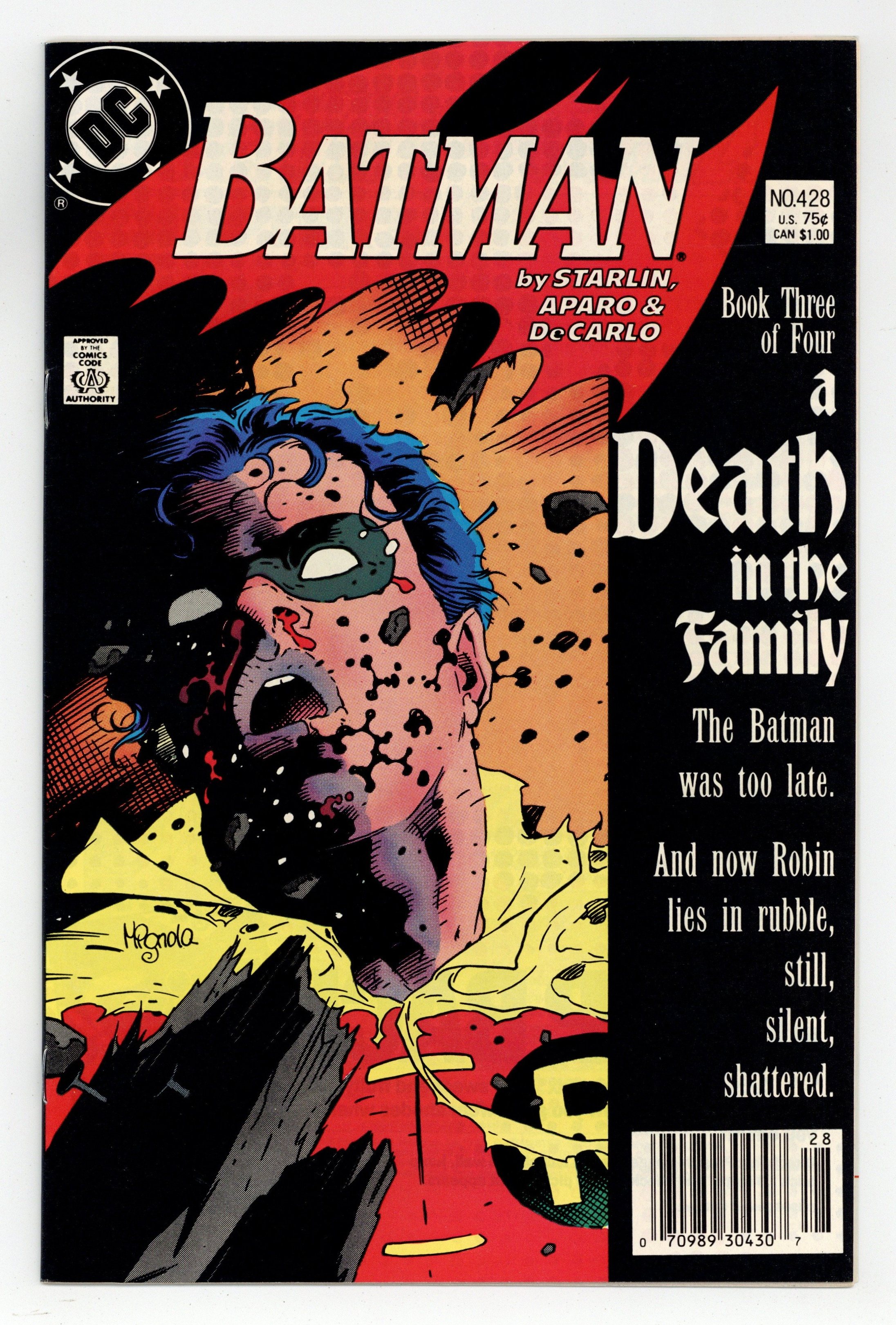 Starts Apr 20 First printing. Newsstand Edition. Cover art by Mike Mignola. "A Death in the Family" part 3 of 4, script by Jim Starlin, pencils by Jim Aparo, inks by Mike DeCarlo; Death of Sheila Haywood; Burial of Sheila Haywood and Jason Todd; The Joker becomes the Iranian Ambassador to the U.N. Results of Phone Poll as to whether Robin dies this issue or not. NOTE: Most issues from 397-432 were reprinted in 1989 and sold in multipacks. These 2nd and 3rd prints have back cover ads dated 1989. 36 Pages, Full Color. Cover price $0.75.