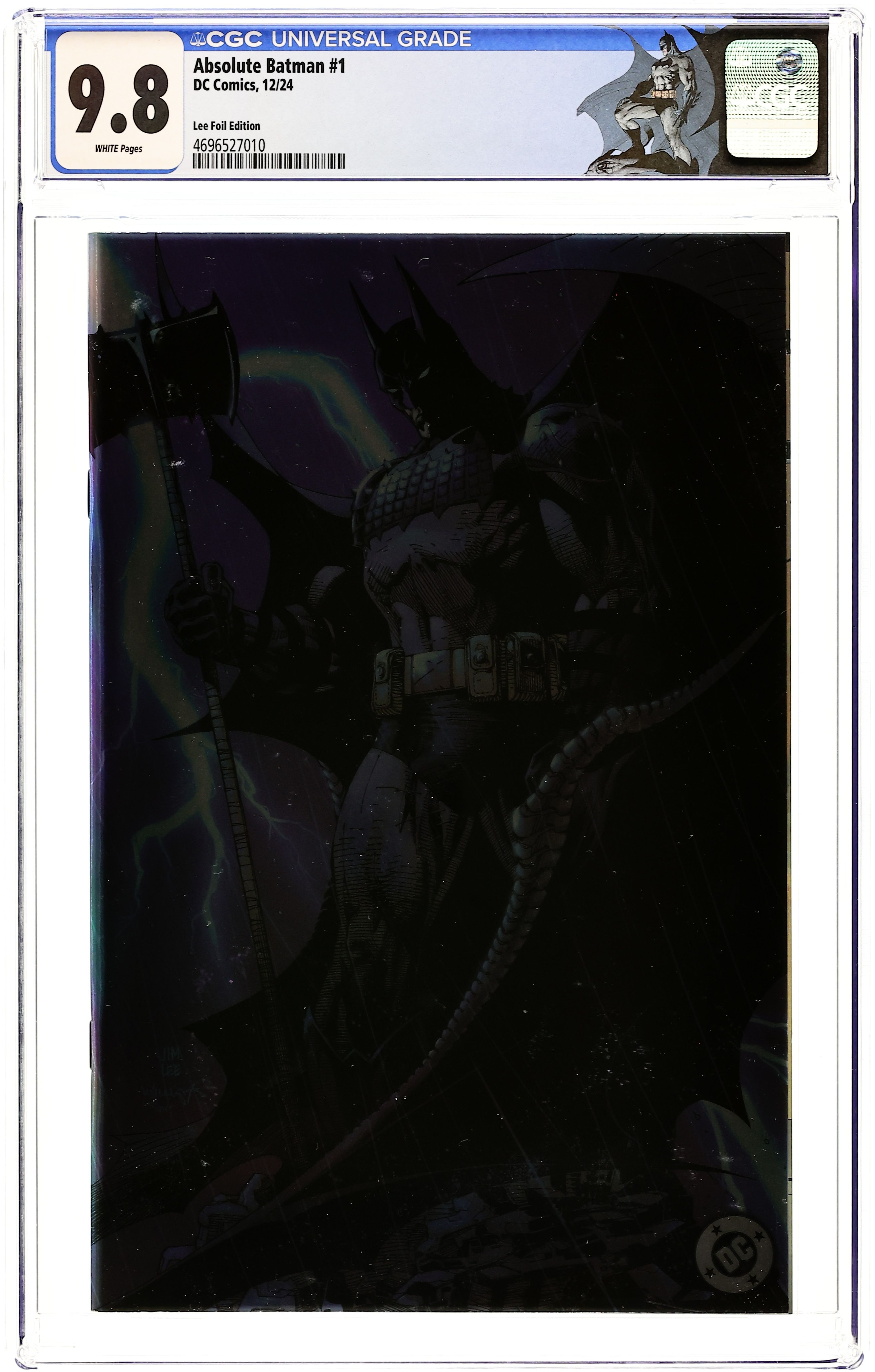 Foil Cover. Written by Scott Snyder. Art by Nick Dragotta. Cover by Jim Lee. BATMAN LEGEND SCOTT SNYDER AND ICONIC ARTIST NICK DRAGOTTA TRANSFORM THE DARK KNIGHT'S TALE FOR THE MODERN AGE! Without the mansion...without the money...without the butler...what's left is the Absolute Dark Knight! 48 pages, full color. Rated T+ Cover price $7.99.