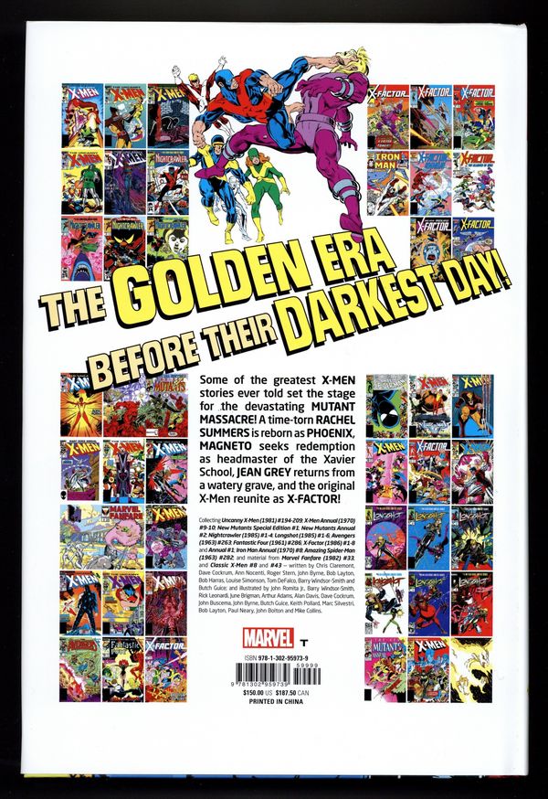 1st printing. Collects The Uncanny X-Men (1963-2011 1st Series) #194-209; The Uncanny X-Men (1963-2011 1st Series) Annual #9-10; New Mutants Special Edition (1985); The New Mutants (1983-1991 1st Series) Annual #2; Nightcrawler (1985 1st Series) #1-4; Longshot (1985 Limited Series) #1-6; The Avengers (1963-1996 1st Series) #263; Fantastic Four (1961-1996 1st Series) #286; X-Factor (1986-1998 1st Series) #1-8, X-Factor (1986-1998 1st Series) Annual #1; Iron Man (1968-1996 1st Series) Annual #8; The Amazing Spider-Man (1963-1998 1st Series) #282; and material from Marvel Fanfare (1982-1992 1st Series) #33, and X-Men Classic (1986-1995 Marvel) Classic X-Men #8 and 43. Written by Chris Claremont, Dave Cockrum, Roger Stern, John Byrne, Bob Layton, Bob Harris, Louise Simonson, Tom SeFalco, Ann Nocenti, Barry Windsor-Smith, and Butch Guice. Art by John Romita, Jr., Barry Windsor-Smith, Dave Cockrum, Art Adams, Rick Leonardi, June Brigman, John Buscema, John Byrne, Butch Guice, Keith Pollard, Paul Neary, Bob Layton, Marc Silvestri, Alan Davis, John Bolton, Mike Collins, Dan Green, Joe Rubinstein, Terry Austin, Whilce Portacio, Al Williamson, Tom Palmer, Ian Akin, Brian Garvey, Brett Breeding, Bob McLeod, P. Craig Russell, Steve Leialoha, Al Gordon, Mike Mignola, and Bill Anderson. Cover by John Romita Jr. and Dan Green. Rachel Summers claims the power of Phoenix, Jean Grey returns from a watery grave and the original X-Men reunite as X-Factor! It's an era of upheaval that puts Marvel's mutants on the path to some of their darkest days! Both Cyclops and Professor X leave the X-Men, but a new teammate waits in the wings: Magneto?! As Storm steps up and Wolverine faces the new Phoenix, the relentless Nimrod targets the team for annihilation! Meanwhile, the newly minted X-Factor grapples with Jean's miraculous resurrection and shares a fateful first encounter with Apocalypse! Plus: The X-Men and New Mutants enlist in the Asgardian Wars, Nightcrawler goes solo and Longshot debuts! Hardcover, 8 1/2-in. x 11-in., 1,496 pages, full color. Rated T Cover price $150.00.