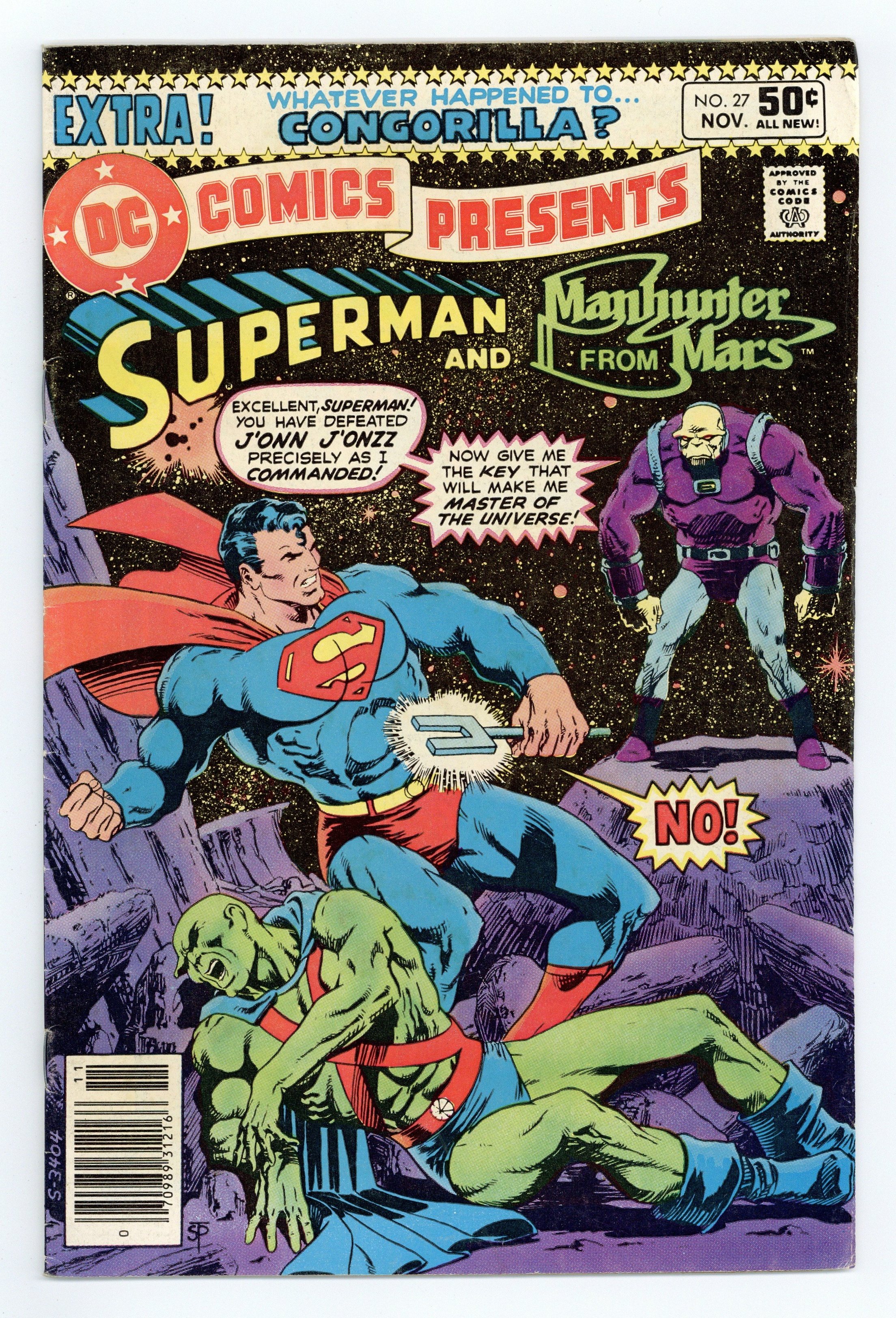Tags: Superman$30.00Newsstand Edition. Superman and Manhunter from Mars star in "The Key That Unlocked Chaos!" First appearance of Mongul. Written by Len Wein, with art by Jim Starlin, Dick Giordano and Frank McLaughlin. Characters: Superman; Martian Manhunter [J'onn J'onzz, Manhunter from Mars]; Mongul (intro, villain); Steve Lombard; Jimmy Olsen; Lois Lane; The Warzoon (aliens, flashback); The Largas (aliens, flashback); green kryptonite. Plus: "Whatever Happened to Congorilla?" Written by Bob Rozakis, with art by Romeo Tanghal and Frank Chiaramonte. Characters: Congo Bill; Congorilla; Golden Gorilla; Janu; Mose; K'Bani (villain); Fred Cantrell (villain). Cover by Jim Starlin. Cover price $0.50.