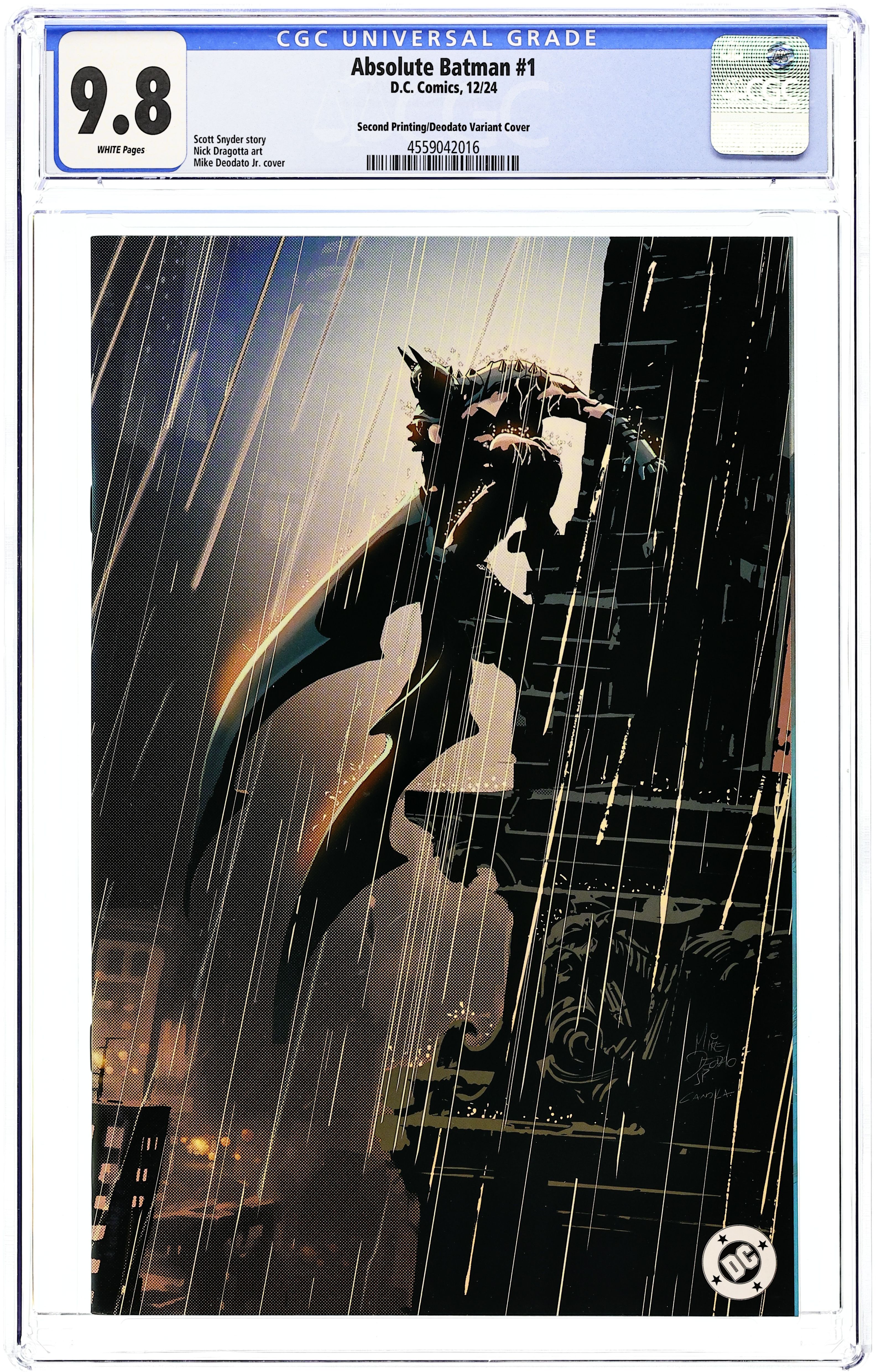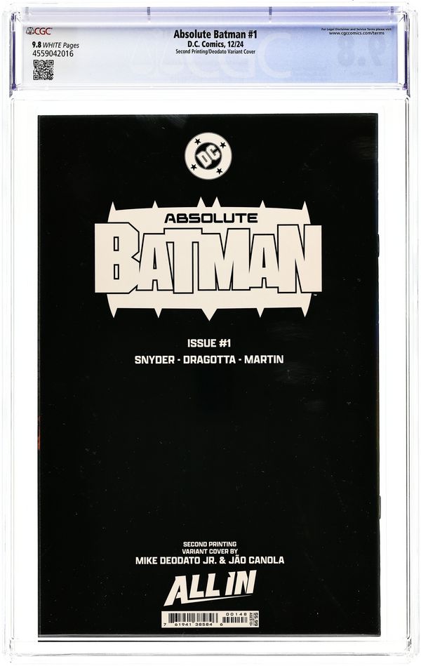 2nd Printing. Cvr B Written by Scott Snyder. Art by Nick Dragotta. Cover by Mike Deodato. BATMAN LEGEND SCOTT SNYDER AND ICONIC ARTIST NICK DRAGOTTA TRANSFORM THE DARK KNIGHT'S TALE FOR THE MODERN AGE! Without the mansion...without the money...without the butler...what's left is the Absolute Dark Knight! 48 pages, full color. Rated T+ Cover price $5.99.