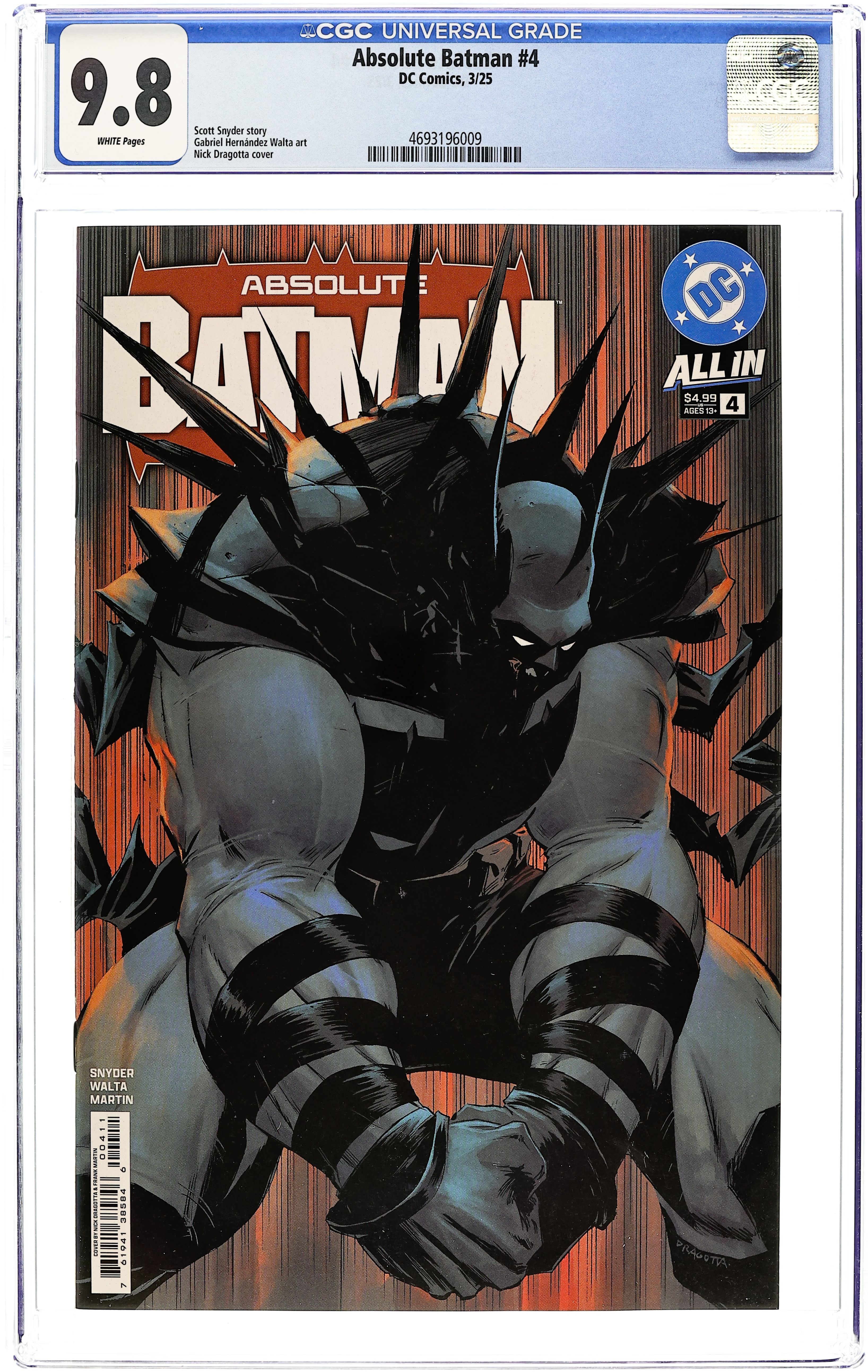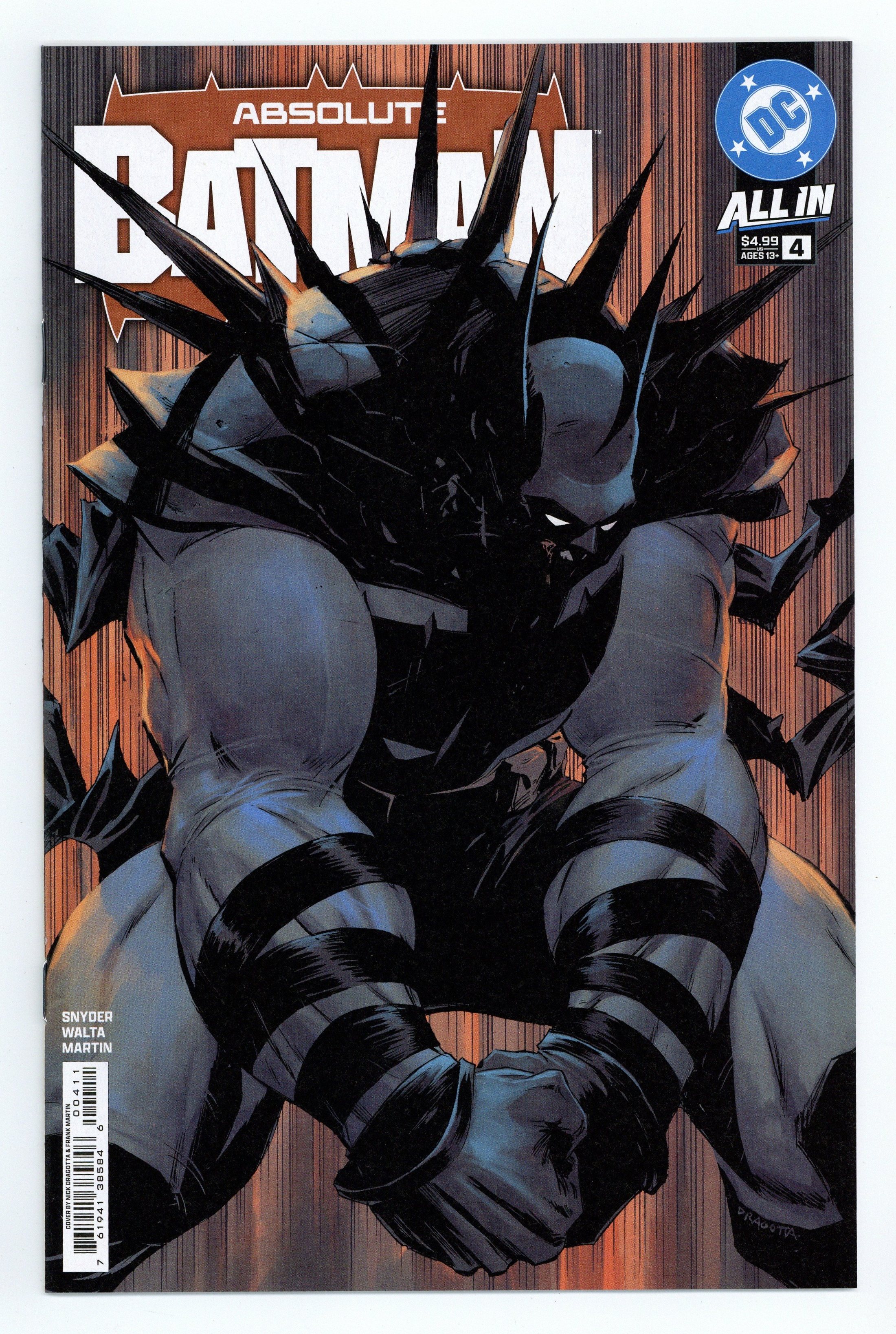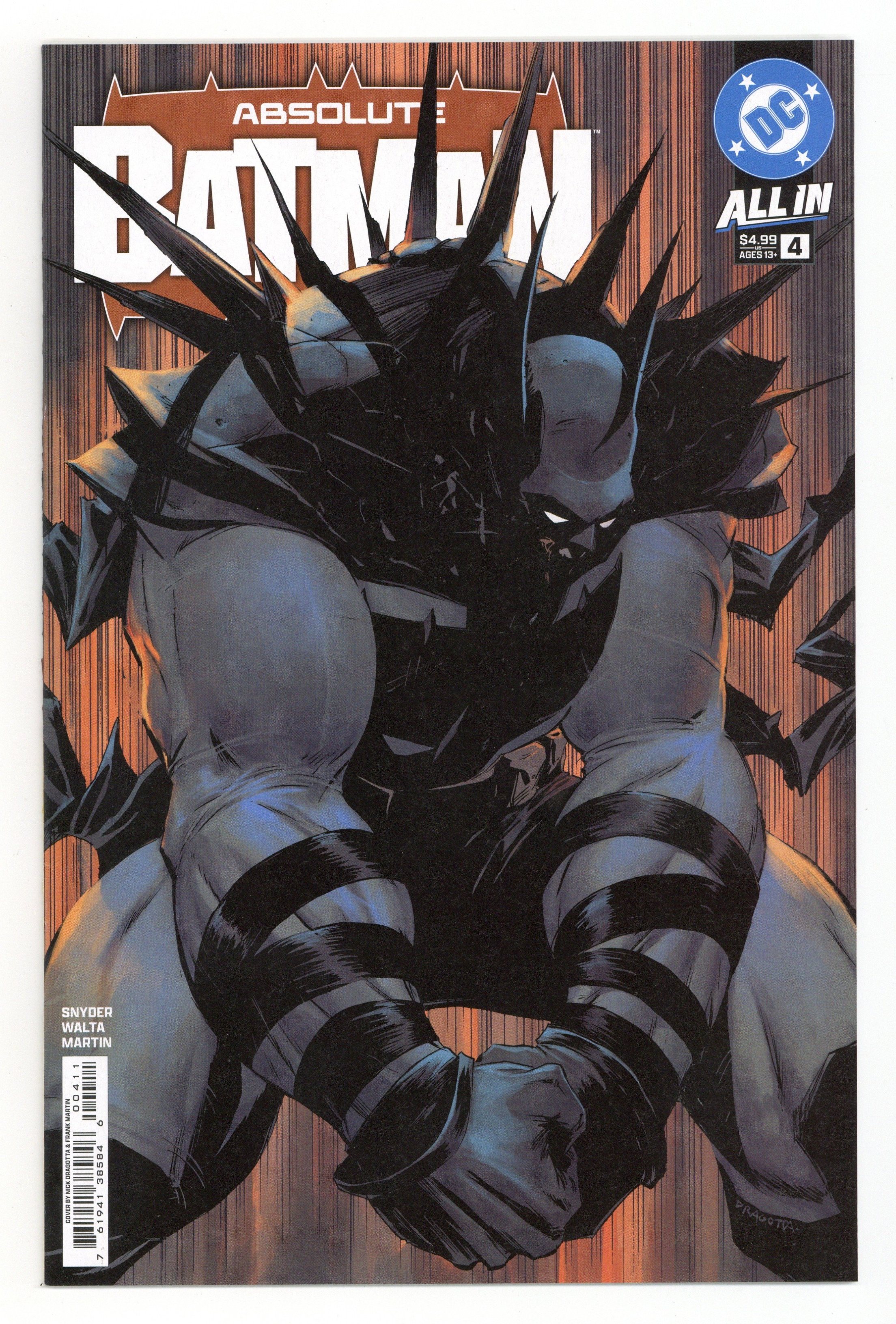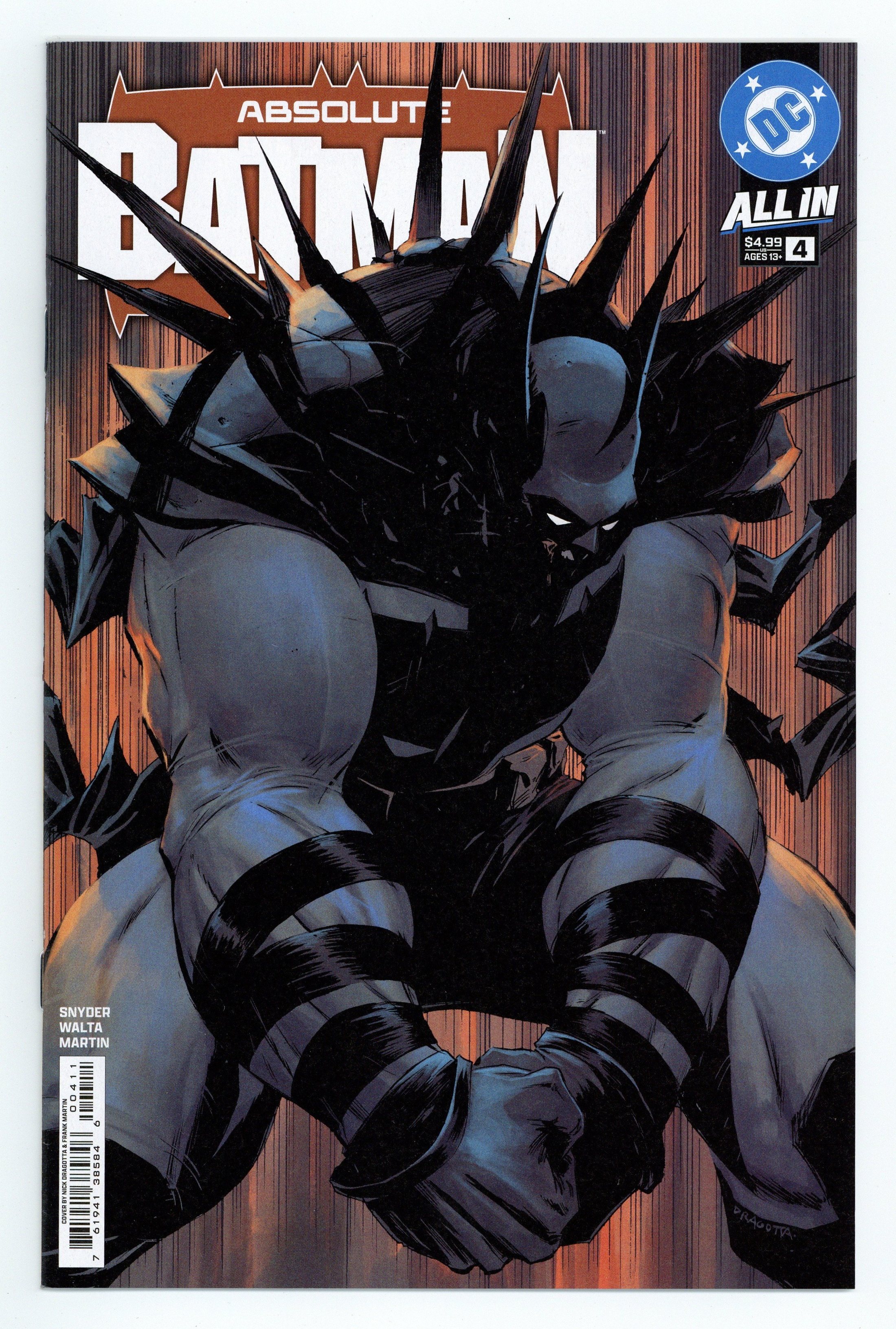 Starts Apr 4 Written by Scott Snyder. Art by Gabriel Walta. Cover by Nick Dragotta. Absolute Batman has established himself as an extremely large force to be reckoned with. But how did he get to this point? How did he push himself? And how did the tragic events of his childhood, and the advice of his father, shape the man who he became...literally? Guest artist Gabriel Walta joins for this essential origin issue of Absolute Batman to explore Bruce Wayne's past, and his inevitable future to go BIGGER. Don't miss this pivotal issue! 28 pages, full color. Rated T+ Cover price $4.99.