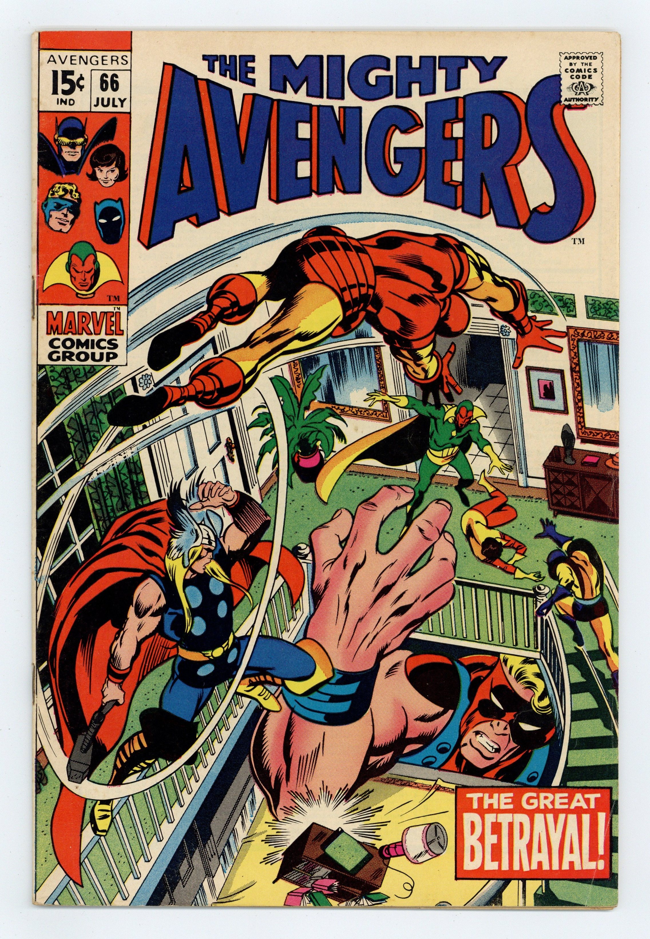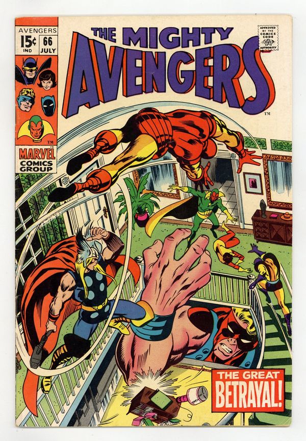 First 15 cent issue. "Betrayal!" Part 1 of 3. First appearance and use of adamantium. Script by Roy Thomas. Pencils by Barry Windsor-Smith. Inks by Syd Shores. Cover by John Buscema and Sam Grainger. Onboard the SHIELD Helicarrier, Earth's Mightiest Heroes test a new metal alloy called adamantium! The metal is so strong that even Thor's hammer cannot fracture it! Wow, what would happen if this awesome alloy fell into the wrong hands? Regrettably, the Avengers don't have to wait long for the answer as the Vision steals the adamantium and then ambushes his fellow avengers inside the mansion! What a shocking development! Could things get any worse? Perhaps only if the Vision's robotic creator were to suddenly appear! An excellent issue! Cameo appearance by Ultron-6. Avengers Lineup: Goliath, Iron Man, Thor, Vision, Wasp, and Yellowjacket. (Notes: Ultron previously appeared (as Ultron-5) in Avengers 57. This is the first of the five issues that Barry Windsor-Smith drew for the Avengers title (1st series): issues 66, 67, 98, 99, and 100. The letters page includes a letter from writer James Van Hise. This story was reprinted in Marvel Super Action 27.) 36 pages. Cover price $0.15.