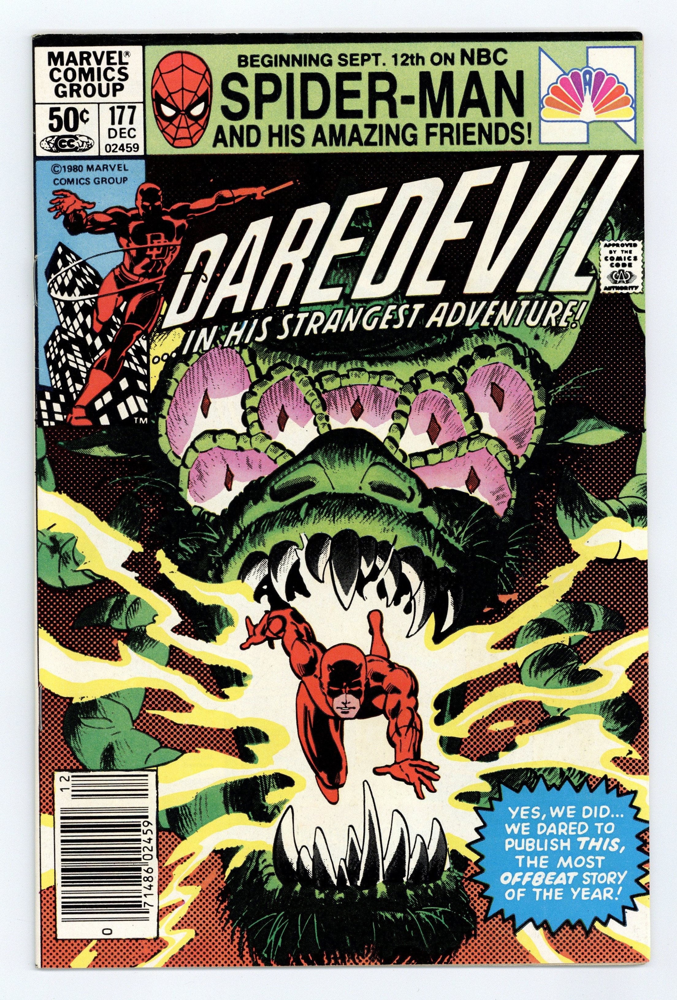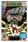 Newsstand Edition. Last 50-cent issue. Cover pencils by Frank Miller, inks by Klaus Janson. Where Angels Fear To Tread, script by Frank Miller, pencils by Frank Miller (breakdowns) and Klaus Janson (finished art), inks by Klaus Janson; Stick helps his old pupil face his demons and regain his radar sense; The Bugle publishes an expose on Kingpin's candidate for Mayor of New York; Elektra is brought to Kingpin's attention; Daredevil origin retold; Jonah Jameson appearance; cameo by the Hand. 36 pgs. Cover price $0.50. Cover price $0.50.