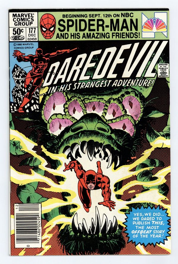 $19.00Newsstand Edition. Last 50-cent issue. Cover pencils by Frank Miller, inks by Klaus Janson. Where Angels Fear To Tread, script by Frank Miller, pencils by Frank Miller (breakdowns) and Klaus Janson (finished art), inks by Klaus Janson; Stick helps his old pupil face his demons and regain his radar sense; The Bugle publishes an expose on Kingpin's candidate for Mayor of New York; Elektra is brought to Kingpin's attention; Daredevil origin retold; Jonah Jameson appearance; cameo by the Hand. 36 pgs. Cover price $0.50. Cover price $0.50.