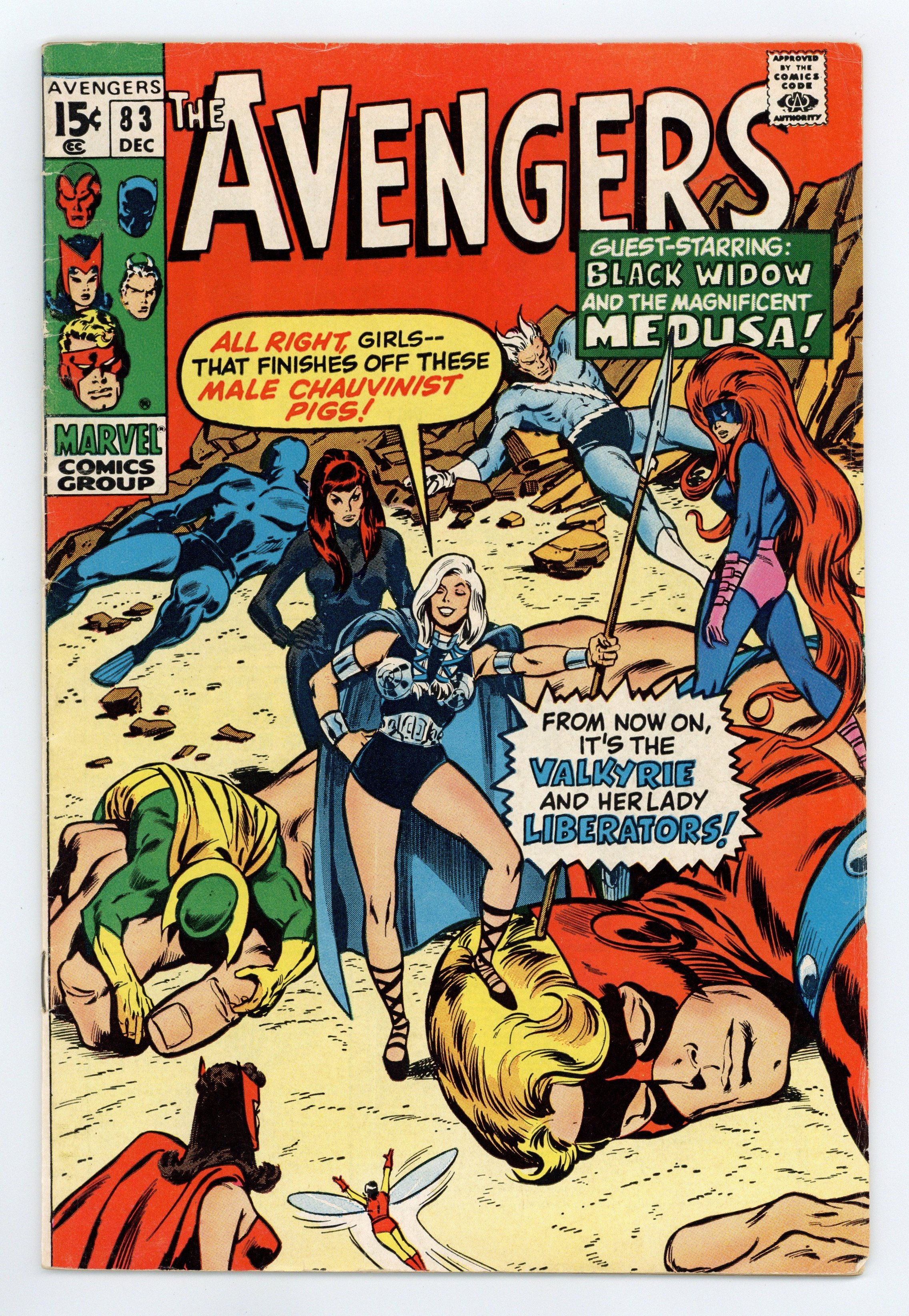 Tags: Marvel Legacy Numbering: Avengers (part 83), Avengers$46.50"Come on in, the Revolution's Fine!" Guest-starring Medusa and the Black Widow. Script by Roy Thomas. Pencils by John Buscema. Inks by Tom Palmer. Cover by John Buscema and Tom Palmer. One of the landmark issues of the bronze age! While Earth's Mightiest Heroes participate in the Halloween parade in Rutland, Vermont; something very strange is taking place at Avengers Mansion! A new superhero called the Valkyrie assembles the Wasp, Scarlet Witch, Black Widow, and Medusa for a special ladies only meeting! The manipulative Valkyrie (with an Asgardian accent) convinces the four heroines to form their own group called the Lady Liberators! And take revenge on their male counterparts in the Avengers! Wow, women's lib to the max! But minutes before the liberators arrive in the green mountain state, the Masters of Evil ambush the Avengers' parade float! Earth's Mightiest Heroes reel under the Masters of Evil's surprise assault until the Lady Liberators strike back…against both teams! Pure chaos in the streets of Rutland! Who could orchestrate such a wild affair? Only an enchanting foe from years ago! Truly an Avengers classic! Cameo appearances by Roy Thomas, Jean Thomas, and Tom Fagan. Cameo Halloween costume appearances by Batman, Captain America, Daredevil, Deadman, Doctor Doom, Dr. Strange, Nighthawk, Sub-Mariner, Thor, and the Red Skull. Flashback cameos by Odin and the Executioner. Masters of Evil Lineup: Klaw, Melter, Whirlwind, and the Radioactive Man. Avengers Lineup: Black Panther, Goliath, Quicksilver, Scarlet Witch, Vision, and the Wasp. (Notes: This is the first appearance or incarnation of the Valkyrie; but not the one of long-time Defenders fame. The next Valkyrie appears in Incredible Hulk 142. This issue was reprinted in Marvel Treasury Edition 7 (published in 1975) and again in Marvel Illustrated Books: The Avengers -- Origin of the Vision (published in 1982). The Avengers return to Rutland for another Halloween parade in Avengers 119.) 36 pgs. Cover price $0.15.