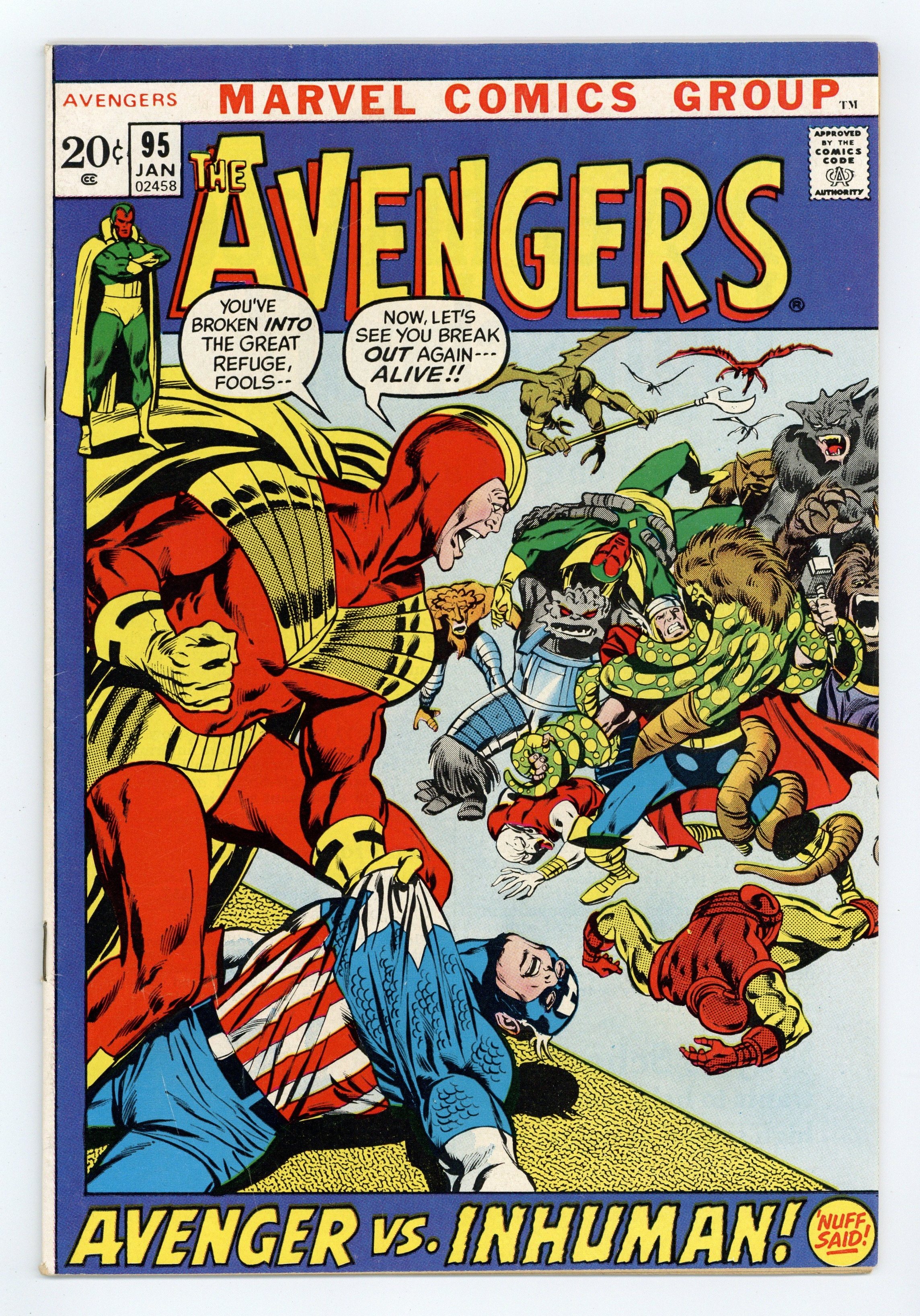 "Something Inhuman This Way Comes..!" Part 7 of 9. Guest-starring Black Bolt and Triton. Script by Roy Thomas. Pencils by Neal Adams. Inks by Tom Palmer. Cover by John Buscema and Tom Palmer. With a direct blast from his power pods, the golden avenger knocks out the Mandroids! And now the Avengers are free to go after the Skrulls in outer space! But hold on...Triton of the Inhumans suddenly appears and begs Earth's Mightiest Heroes for help! The Kree have installed Maximus as the new ruler of the Great Refuge! And exiled Black Bolt to San Francisco of all places! Once Cap and Goliath recover Black Bolt from the Bay Area, the Mighty Avengers assemble in the Hidden Land to overthrow Maximus the Mad! Can Earth's Mightiest Heroes liberate the Great Refuge and check the Kree's earthward advance? A tremendous issue! Cameo appearances by Nick Fury, Captain Marvel, Quicksilver, the Scarlet Witch, and Supreme Intelligence. Avengers Lineup: Captain America, Goliath, Iron Man, Thor, and the Vision. (Notes: This issue's brilliant artwork begins with the classic splash page depicting Triton coming out of the water... and ends with Captain America looking up to the heavens and shaking his fist at the Kree and the Skrulls. Elements of the plot from Amazing Adventures (2nd series) 10 continue in this issue. Additional details of Black Bolt's origin are revealed during the story. There is some question as to whether Neal Adams contributed pencils to the cover.) 36 pages. Cover price $0.20.