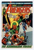 "The Andromeda Swarm!" Part 8 of 9. Guest-starring Captain Marvel. Script by Roy Thomas. Pencils by Neal Adams. Inks by Tom Palmer. Cover by Neal Adams and Tom Palmer. Finally, the Avengers blast off into outer space to take the fight to the Kree and the Skrulls! On the edge of the AndromedaGalaxy, Earth's Mightiest Heroes engage the awesome Skrull armada! Cap, Shell-Head, Thor, and the Vision attack the armada's flagship hoping to turn back the entire fleet! During the ferocious battle inside, the Avengershear about the Skrulls' secret plan to destroy the Earth! And as shown on the dynamic cover, an enraged Vision will do whatever it takes to uncover the devious plan (and rescue the Scarlet Witch)! Meanwhile on Hala, the Kree home planet; the power struggle between the Supreme Intelligence and Ronan the Accuser quietly rages behind the scenes...with Rick Jones caught in the middle! Cameo appearances by Nick Fury and Annihilus. Avengers Lineup: Captain America, Goliath, Iron Man, Quicksilver, Scarlet Witch, Thor, and the Vision. 36 pages. Cover price $0.20.