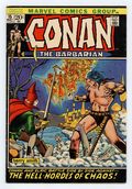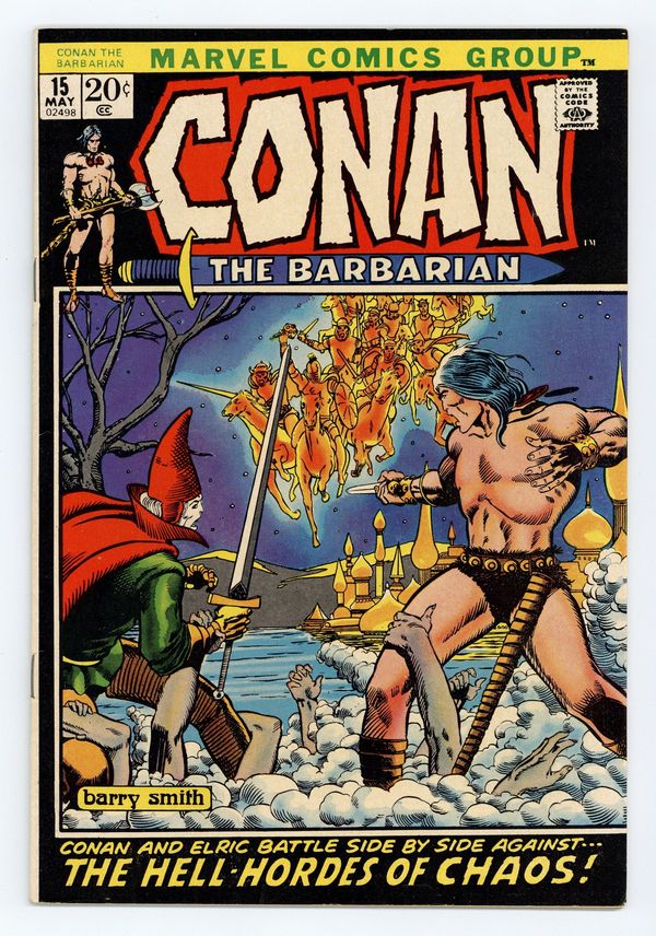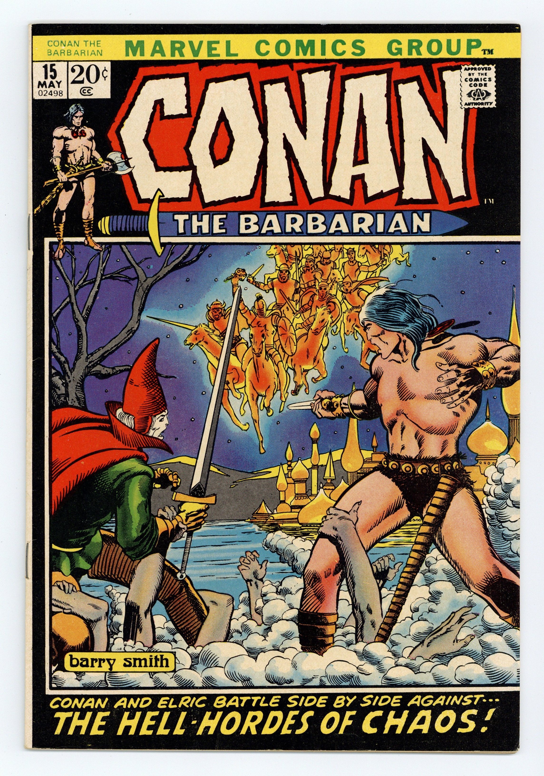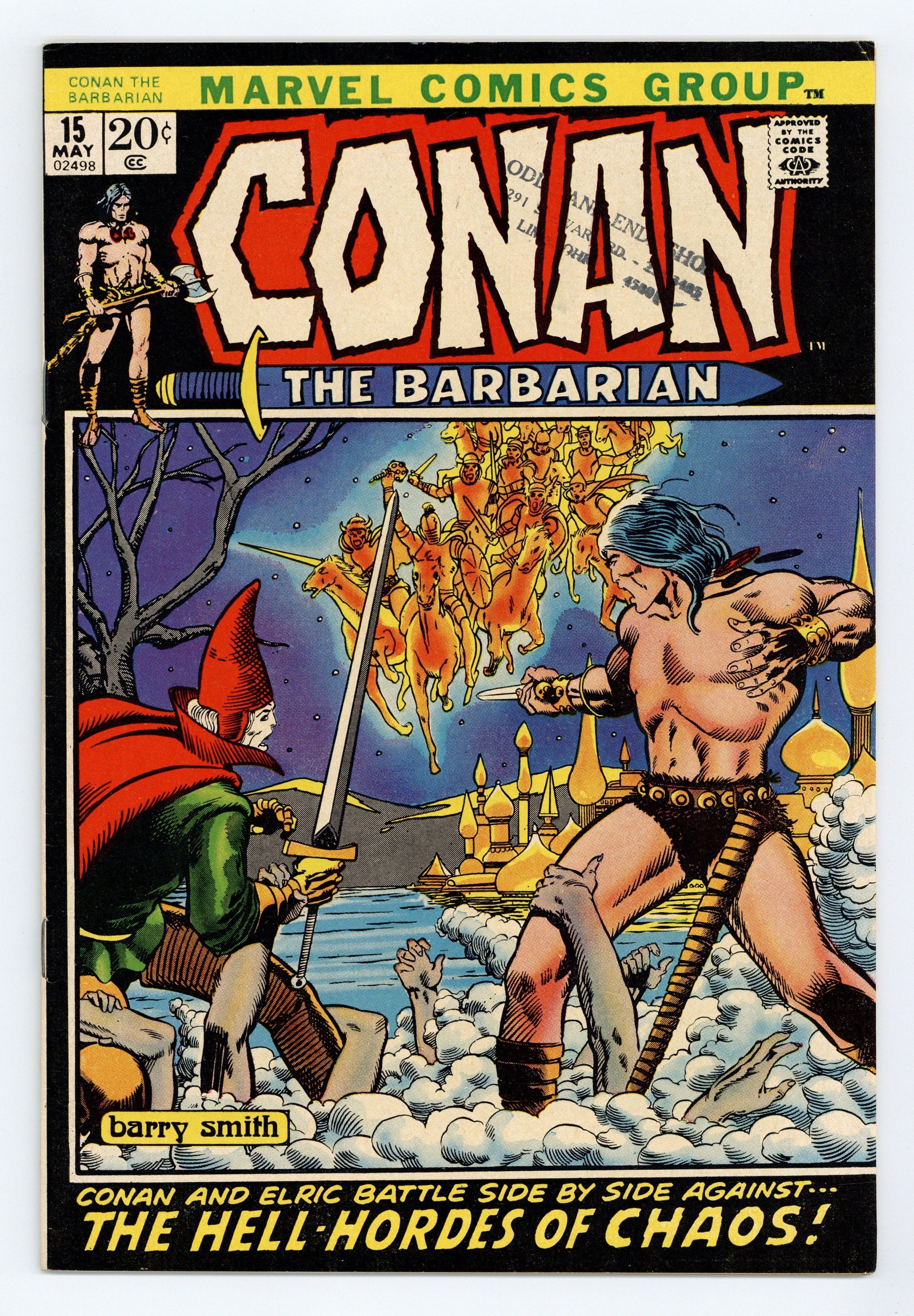 Cover art by Barry Windsor-Smith. Elric guest-stars in The Green Empress of Melnibone, plot by Michael Moorcock and James Cawthorn, script by Roy Thomas, pencils by Barry Windsor-Smith, inks by Sal Buscema; Conan and Elric have an un-easy truce while they ride to the sunken city known as Yagala; Once there they have to face Xiombarg, Prince Gaynor the Damned, Kulan-Gath and Terhali; When their combined power is not enough to defeat them Arkyn must join the fight to help them. Letter to the editor from artist William Stout. 36 pgs. Cover price $0.20.