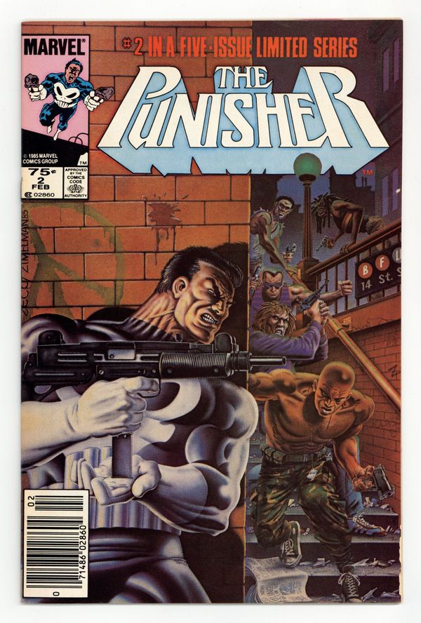 Tags: Punisher$25.00Newsstand Edition. "Back to War!" Story by Steven Grant. Art by Mike Zeck and John Beatty. Cover by Mike Zeck and Phil Zemelman. NOTE: War Journal Entry: #1053. Out of jail, thanks to The Trust, the Punisher sets out to take out the biggest criminal of them all – the Kingpin. Cover price $0.75.