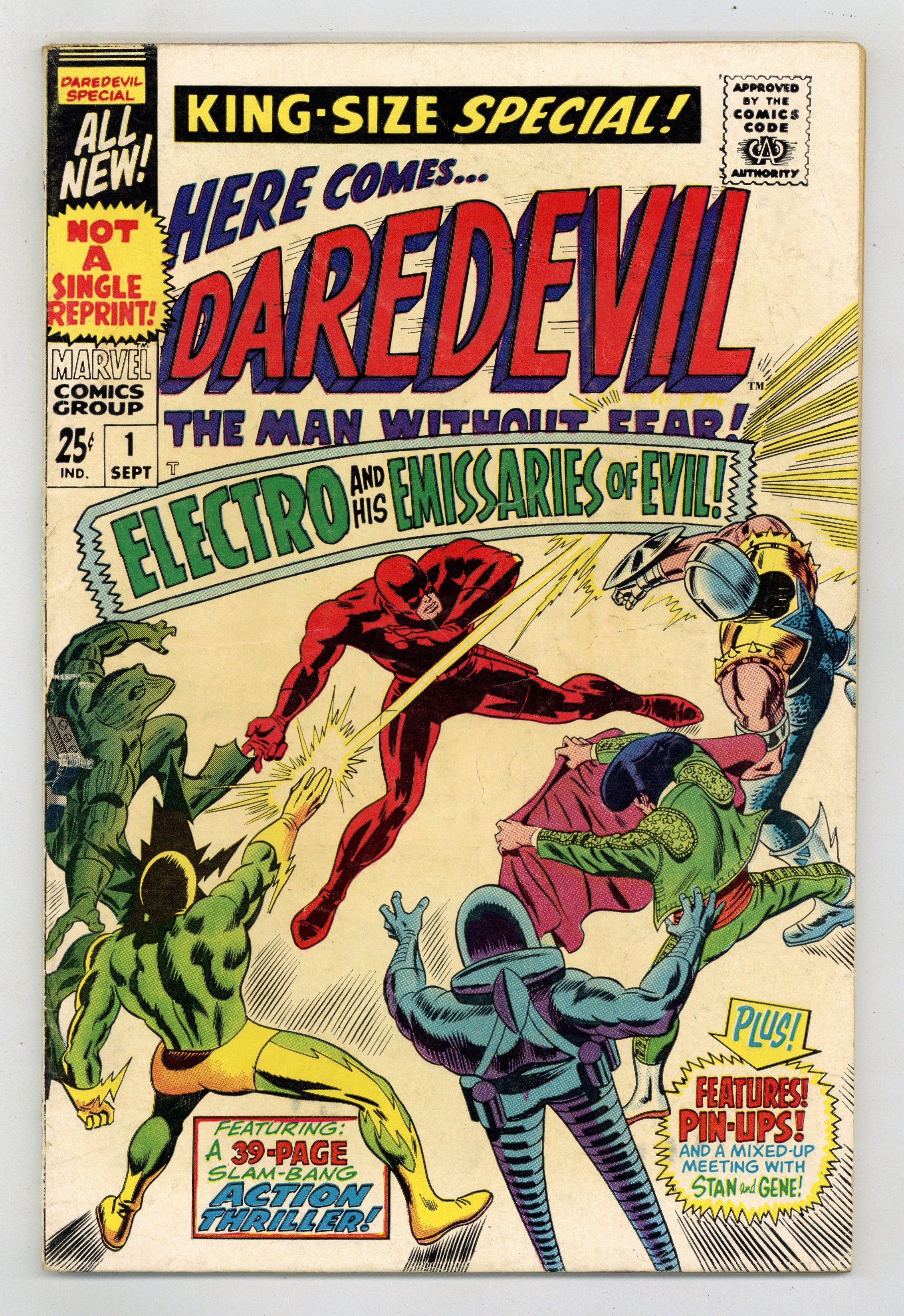 Ends Dec 15 8:07 PM CST Bid History 3 bids Current Bid $12 Your Secret Max Bid If you'd like to bid, please log in or register. 64-page all-new giant-size issue (no reprints). "Electro and the Emmisaries of Evil!" Script by Stan Lee, pencils by Gene Colan, inks by John Tartaglione. Back-up features inclue "Inside Daredevil" (2 pages of "far-out facts"), "An Explanation" (two pages about Mike Murdock), "Blueprint for an All-Purpose Billy Club" (one page), "At the Stroke of Midnight" (three pages showing Lee and Colan in a story conference), and pin-ups of Karen Page, Foggy Nelson, Ka-Zar, Daredevil, the Gladiator, the Leap-Frog, the Owl, and the Masked Marauder.. Colan/Frank Giacoia cover. Cover price $0.25.