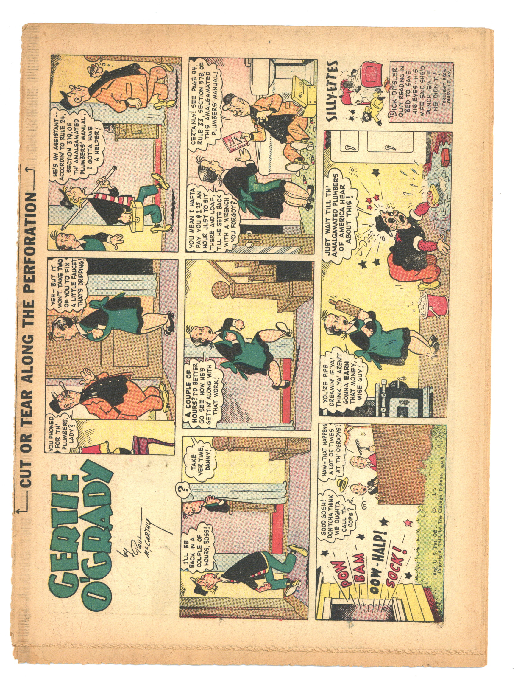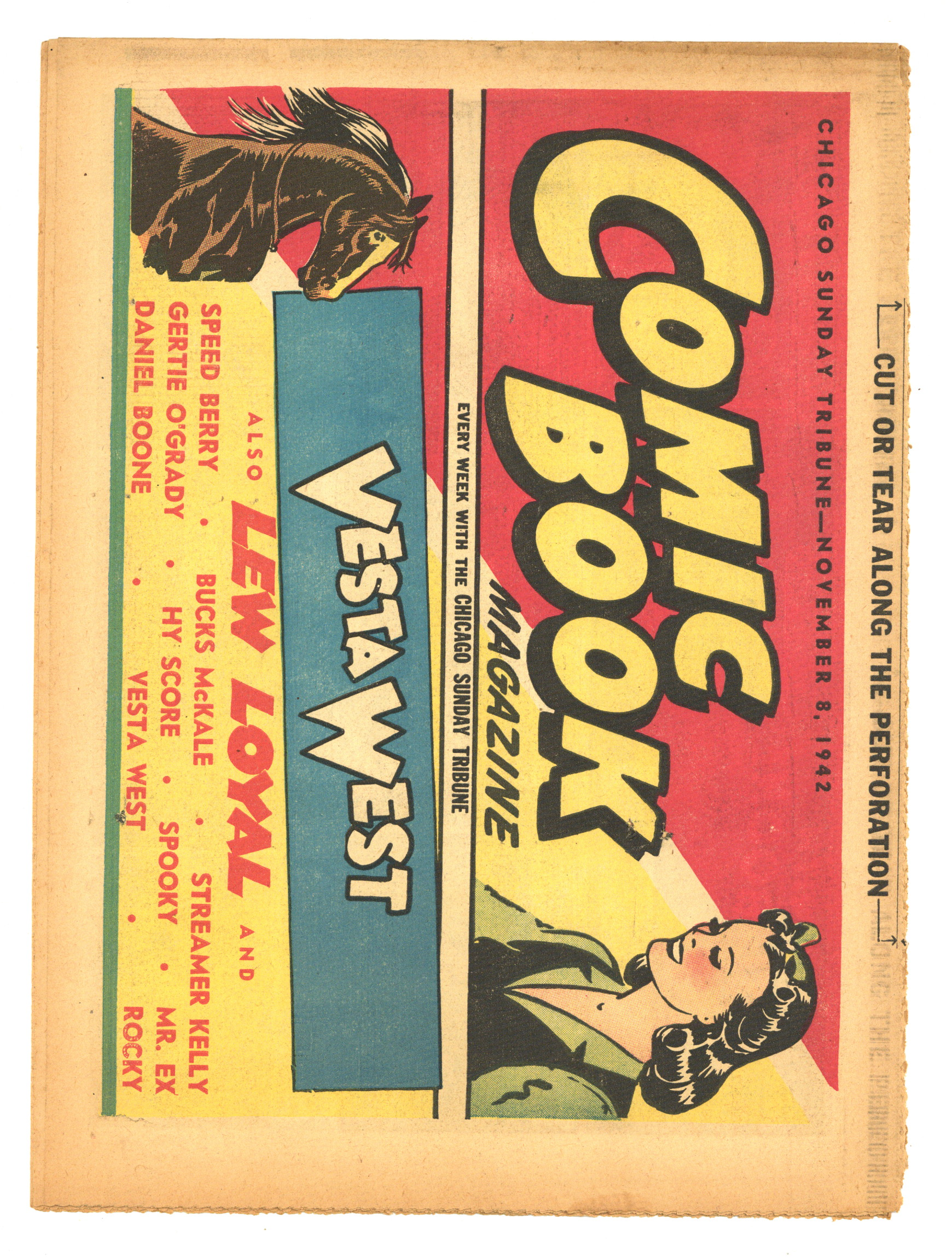 November 8, 1942. Comic Book Magazine is published by the Chicago Tribune. Enjoy such comic strips as Texas Slim and Dirty Dalton, Lew Loyal, Kit Cabot, Spooky, Fighting with Daniel Boone, and many more. Originally came each Sunday with the Chicago Sunday Tribune. 16 pages, full color, 18.50-in X 13.25-in.