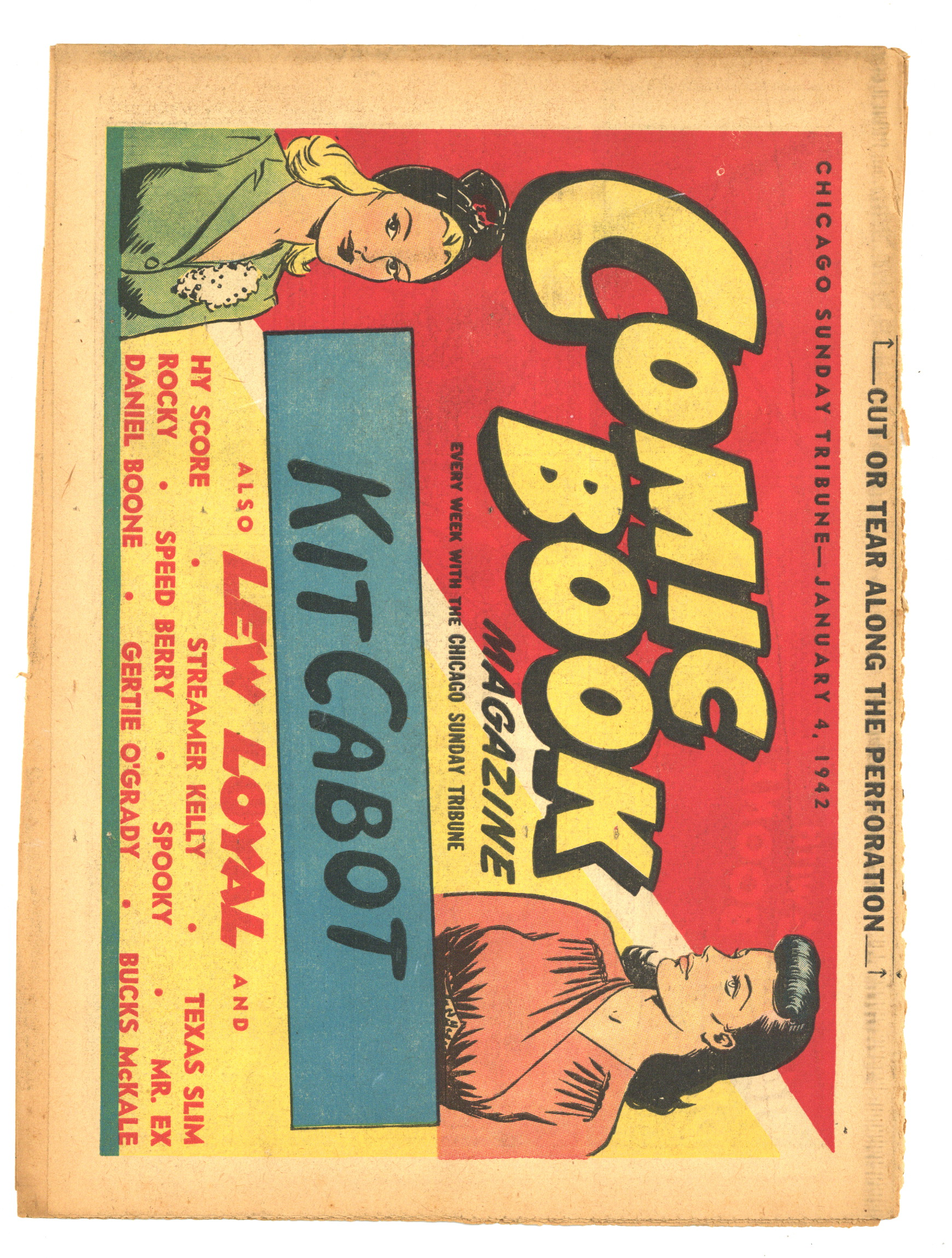 Published Jan 1942 by Chicago Tribune.$40.00January 4, 1942. Comic Book Magazine is published by the Chicago Tribune. Enjoy such comic strips as Texas Slim and Dirty Dalton, Lew Loyal, Kit Cabot, Spooky, Fighting with Daniel Boone, and many more. Originally came each Sunday with the Chicago Sunday Tribune. 16 pages, full color, 18.50-in X 13.25-in.