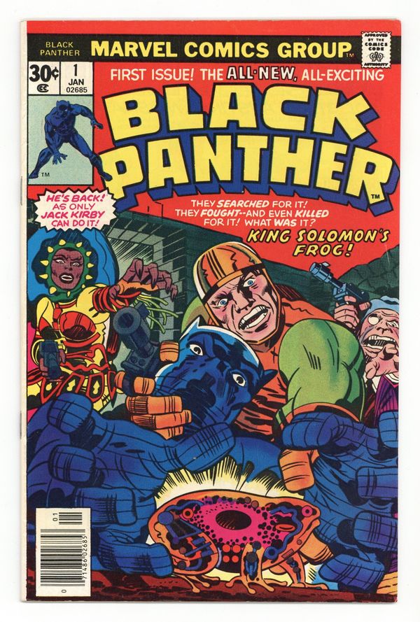 Starts Apr 4 Cover pencils by Jack Kirby, inks by John Verpoorten. King Solomon's Frog!, script and pencils by Jack Kirby, inks by Mike Royer; Black Panther helps Abner Little, a member of the Collectors, recover the Brass Frog, an ancient time machine; Due to its dangerous nature, the Frog had previously been hidden away by the Black Panther's grandfather, Azzuri, but was taken by Alfred Queely, a fellow member of the Collectors; After getting the Frog, the Black Panther and Little are attacked by Princess Zanda, another member of the Collectors, for control of the artifact. During the battle, the Frog is activated and a mysterious creature, Hatch-22, appears. Jack Kirby writes about what readers can expect from his new Black Panther. 36 pgs. $0.30. Cover price $0.30.