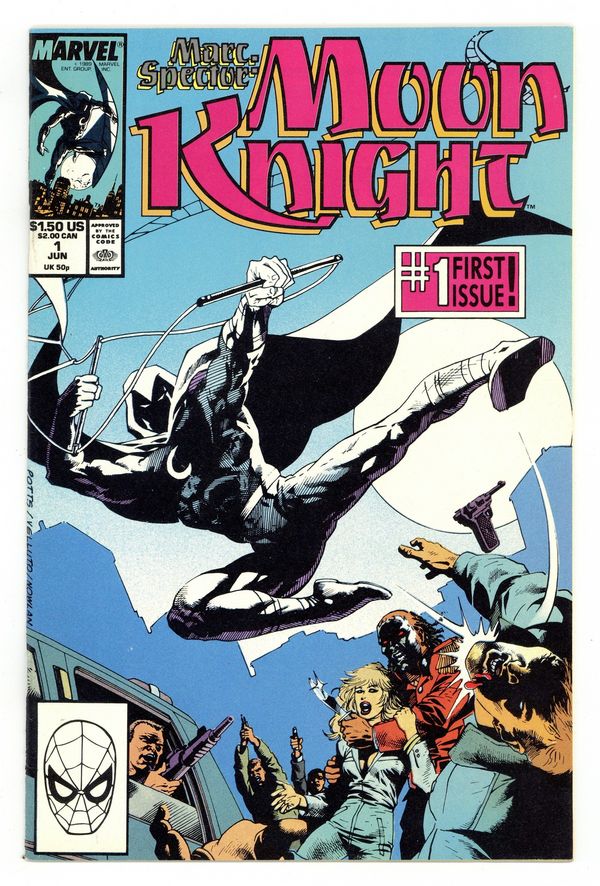 New Moon - Written by Chuck Dixon. Art by Sal Velluto & Mark Farmer. Cover by Carl Potts, Sal Velluto & Kevin Nowlan. By popular demand, the white Avenger returns in an all-new series! And Marc Spector's first adventure brings him face to face with the man who caused him to become Moon Knight -- Bushmaster! 32 pages, full color. Cover price $1.50.