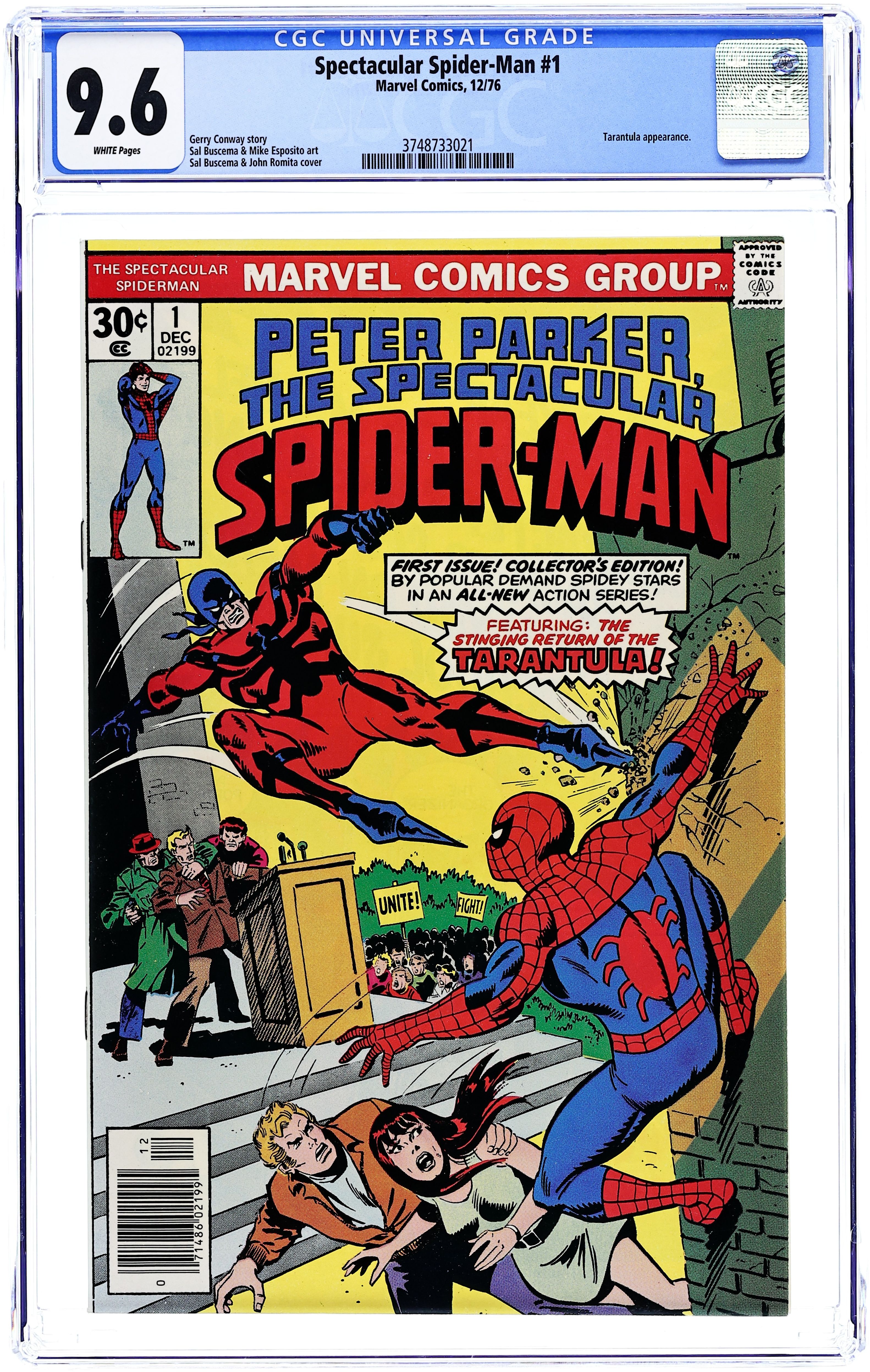 Ends Mar 30 9:26 PM CST Bid History 12 bids Current Bid $41 Your Secret Max Bid If you'd like to bid, please log in or register. "Twice Stings The Tarantula!" Part 1 of 3. Script by Gerry Conway. Pencils by Sal Buscema. Inks by Mike Esposito. Cover by Sal Buscema and John Romita. The first issue of a brand new series for Spider-Man! The story opens with a bang as the Tarantula kidnaps the Empire State University vice-chancellor, despite the best efforts of the web-slinger, Flash Thompson, and Mary Jane Watson! Next, the Tarantula tries to kill the mayor, but this time the Spectacular Spider-Man is ready! Can the wall-crawler beat the Tarantula and save Mayor Abe Beame? First appearance of Edward Lansky (aka Lightmaster). (Notes: The Spectacular Spider-Man series became the third monthly title for Spider-Man. The first issue of the series debuted the same month as Amazing Spider-Man 163 and Marvel Team-Up 52. The letters page contains an essay from Gerry Conway describing the plans for the new Spider-Man title.) 32 pages Cover price $0.30.