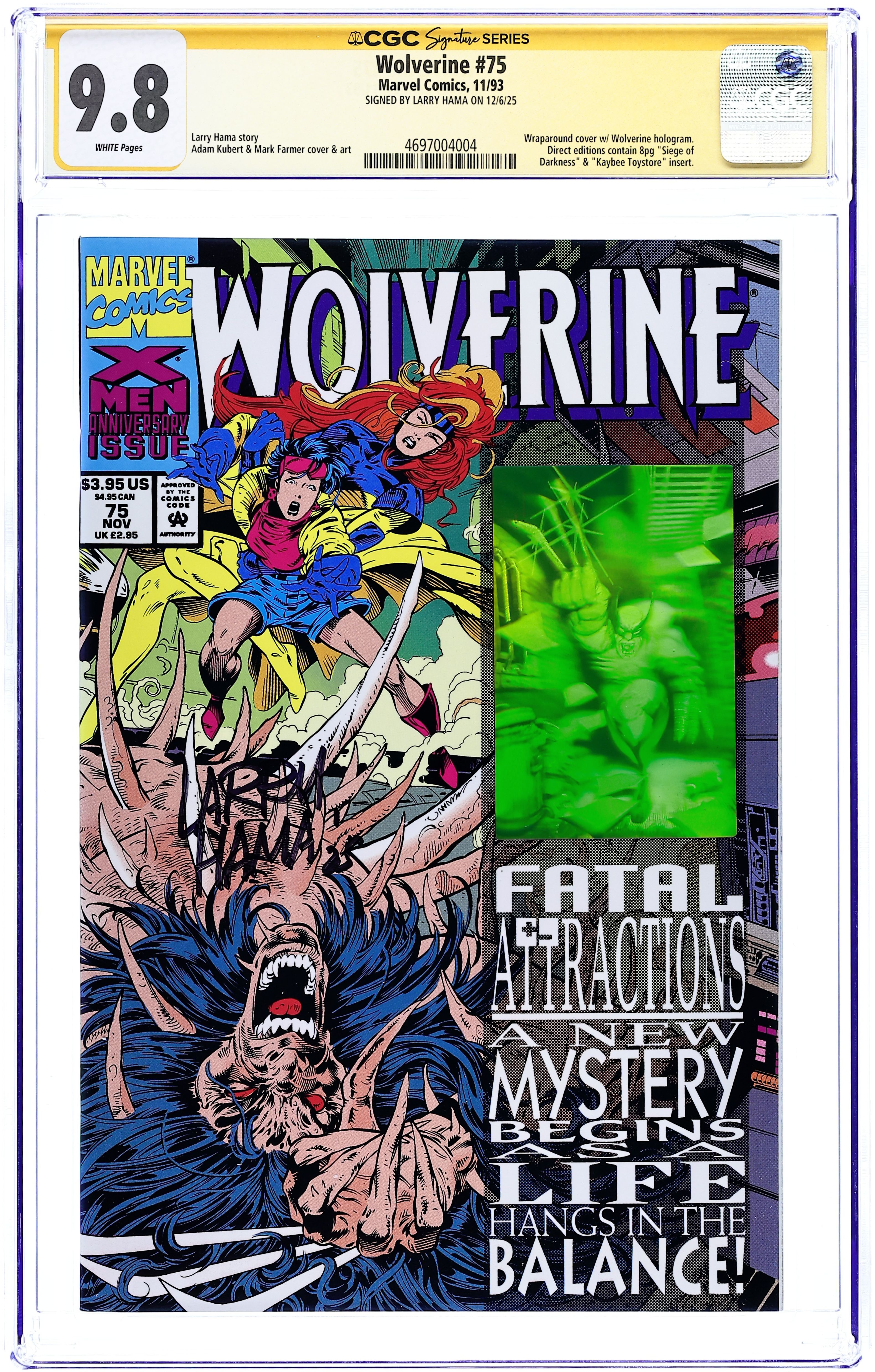 Starts Apr 4 Direct Edition. Fatal Attractions: Part 5 of 6 - Hologram card on cover - "Nightmares Persist!" Guest-starring the X-Men. Written by Larry Hama. Art by Adam Kubert, Mark Farmer, Dan Green, and Mark Pennington. Story continued from X-Men (1991-2008 1st Series) #25 - The storyline that changed the feral X-Man's life continues! Magneto, the Master of Magnetism, just sucked out all the Adamantium in Wolverine's body, leaving him a bloody, pulpy mess. First appearance of Wolverine's bone claws. Can even Wolverine's vaunted healing factor save him this time? Can Jean Grey's mutants powers keep his body in one piece long enough for it to try? Story concludes in Excalibur #(1988 1st Series) #71. 32 pages, FC NOTE: Adam Kubert jumps on board with issue joining Larry Hama on a run that will some of the finest Wolverine stories to date. In a time of Clone Sagas, Heroes Reborn, and watered down tough guys with guns comics, the Kubert/Hama run on Wolverine (along with the Age of Apocalypse storyline) kept me reading comics long enough for them to get good again. - Odinson, Lone Star Comics Archivist Cover price $3.95.