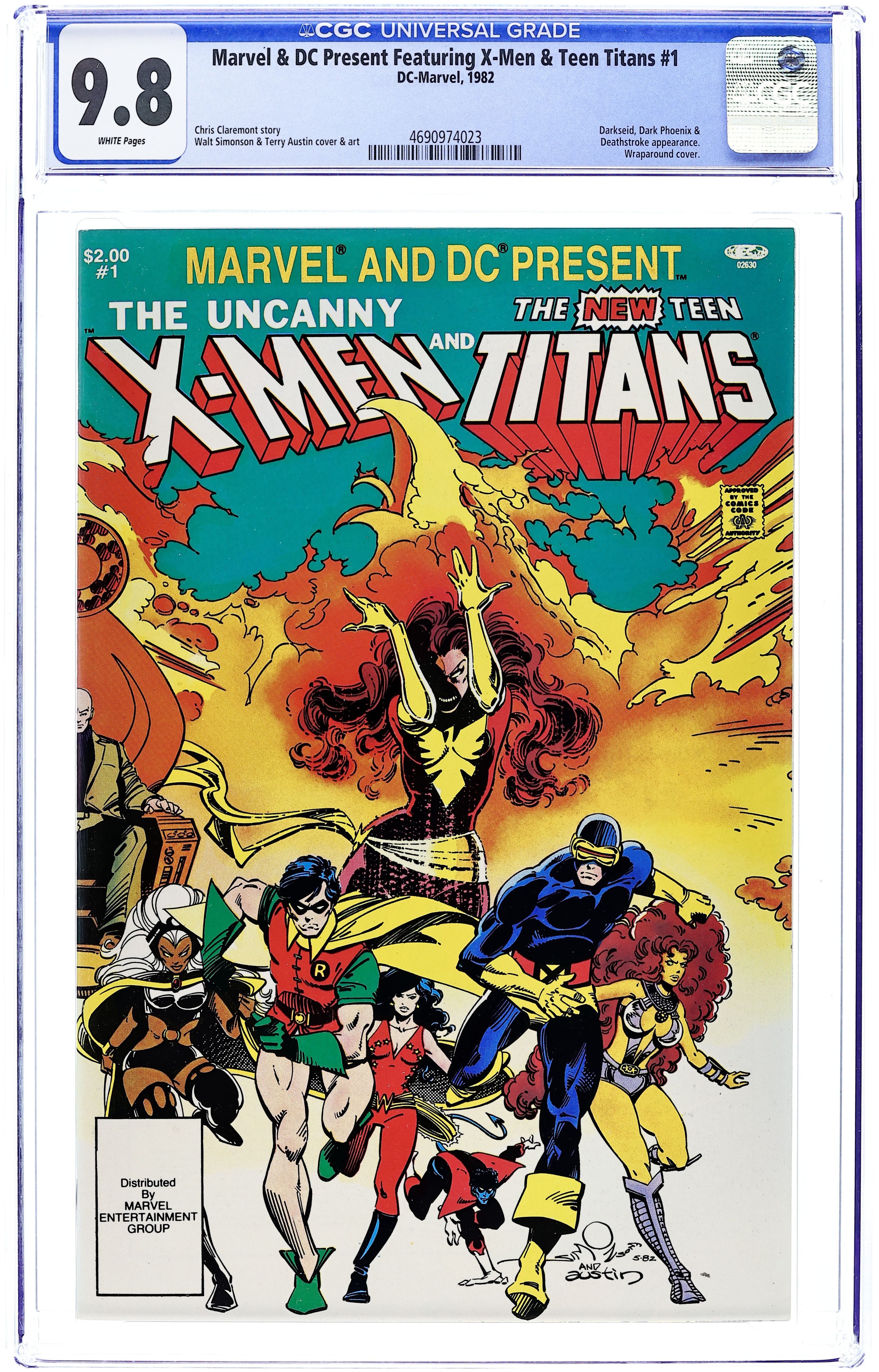 Direct Edition. Darkseid, Dark Phoenix and Deathstroke on one side! The Uncanny X-Men and the New Teen Titans on the other! It's the rumble heard throughout the cosmos in the 64-page "Apokolips...Now." Metron, Professor X, Wolverine, Cyclops, Storm, Nightcrawler, Colossus, Kitty Pryde, Robin, Starfire, Raven, Wonder Girl, Kid Flash, Cyborg, Changeling. Script by Chris Claremont, pencils by Walt Simonson, inks by Terry Austin. Inside front cover by Simonson. Wraparound cover by Simonson & Austin. First printing (a 2nd printing was published, but is marked as a 2nd printing). NOTE: 1st appearance of the Source Wall. Though it had been referred to before it had never been seen until this issue. - Odinson, Lone Star Comics Archivist Cover price $2.00.