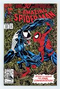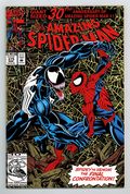 Direct Edition. 30th Anniversary issue of Amazing Spiderman #1. "The Bride of Venom" Part 2 of 2. Script by David Michelinie. Pencils by Mark Bagley. Inks by Randy Emberlin. Gold foil holografix cover by Mark Bagley and Randy Emberlin. Inside an abandoned Brooklyn amusement park, the Lethal Protector holds Richard and Mary Parker captive! The disturbed Venom thinks he's just doing what's best for Peter's parents! But that's not going to work! No way, no how! So, the wall-crawler heads to the park knowing a fierce fight awaits! However, the web-slinger may have help this time from a very unlikely source... Eddie Brock's ex-wife! Wow, will there be a family reunion atop the Ferris wheel? Or perhaps a funeral beneath it? One way or another, the Amazing Spider-Man and Venom battle for the last time! Cameo appearances by Silver Sable, Battlestar, Mary Jane Watson, and J. Jonah Jameson. Second story: "True Friends!" Script by Tom DeFalco. Pencils by Patrick Olliffee. Inks by Mark McKenna. Aware of what the Human Torch did to Empire State University, Spider-Man vows to bring his friend to justice. Cameo appearance by Silver Sable. Plot crosses over with Fantastic Four 373 & 374. Third story: "The Monster Within" Script by Eric Fein. Art by Dan Panosian. JJJ tries to get his son, John Jameson, started in the field of journalism. Fourth story: "Echoes..." Script by Terry Kavanagh. Pencils by Aaron Lopresti. Inks by Don Hudson. The Chameleon visits the grave of Kraven the Hunter. (Notes: Venom appears next in the first issue of his Lethal Protector (1993) series. The letters page includes a statement of ownership: average print run 660,958. average paid circulation 544,900.) 68 pages. Cover price $3.95.