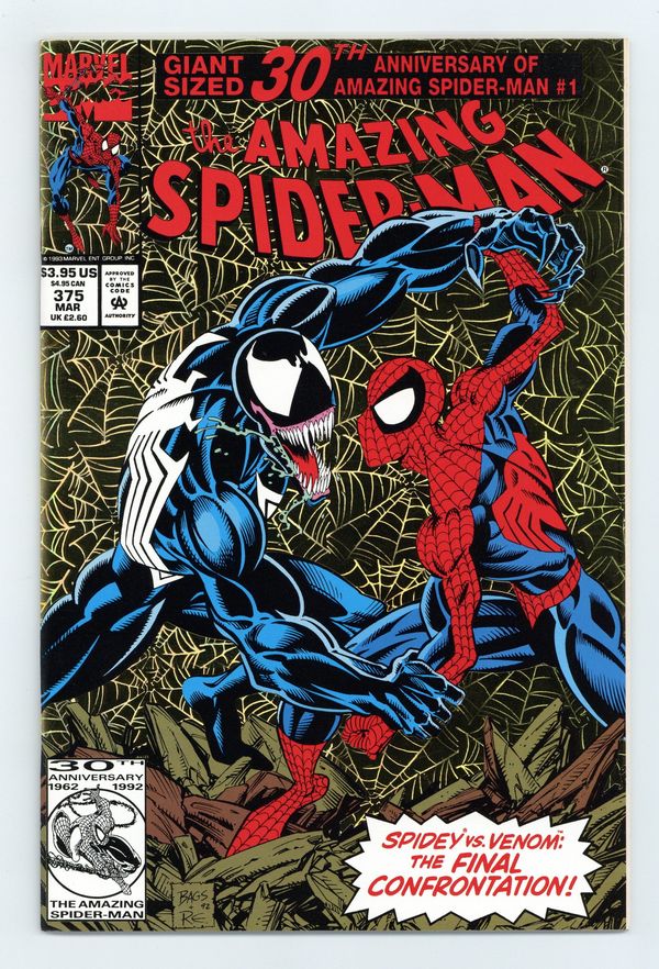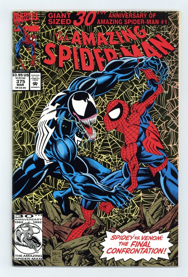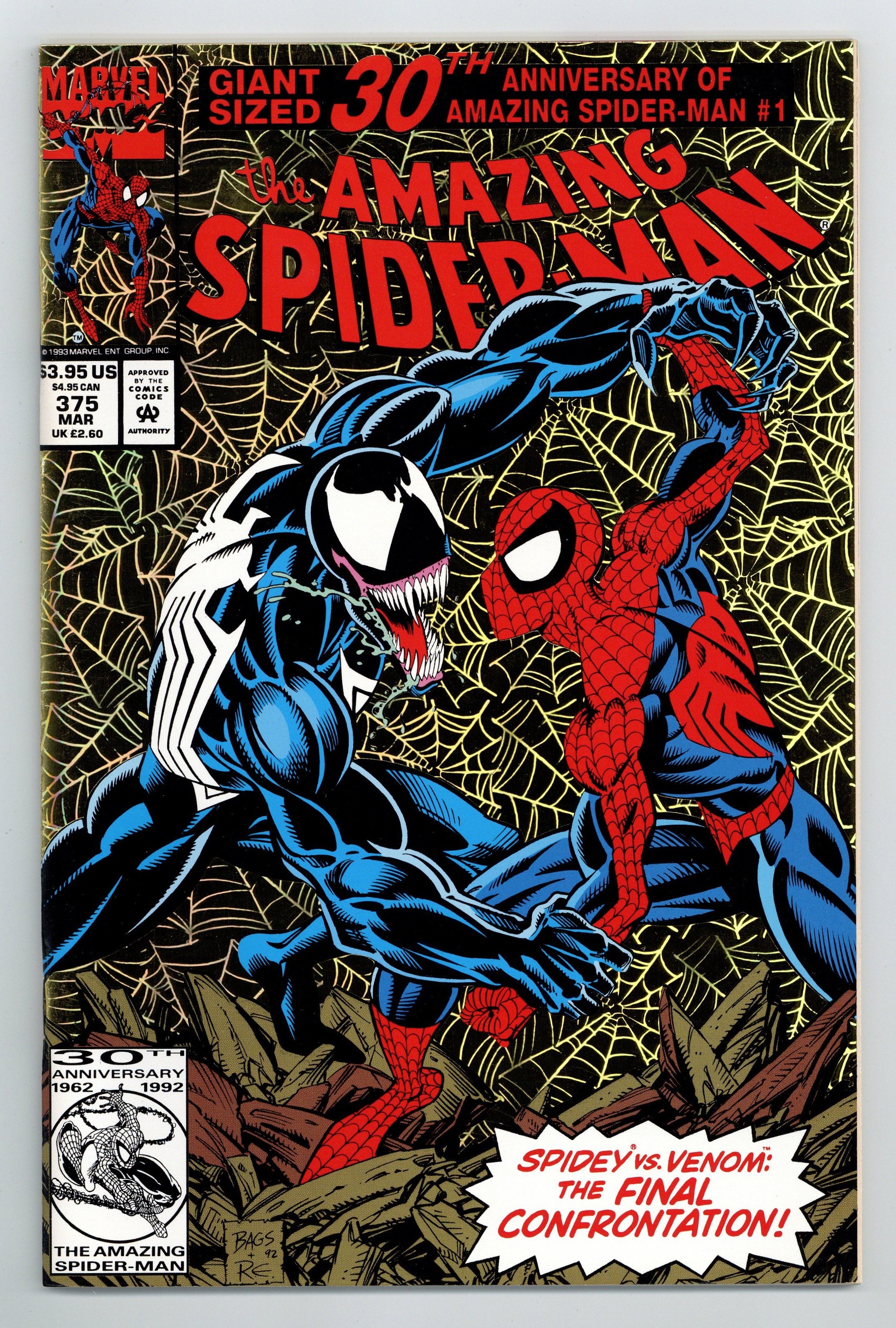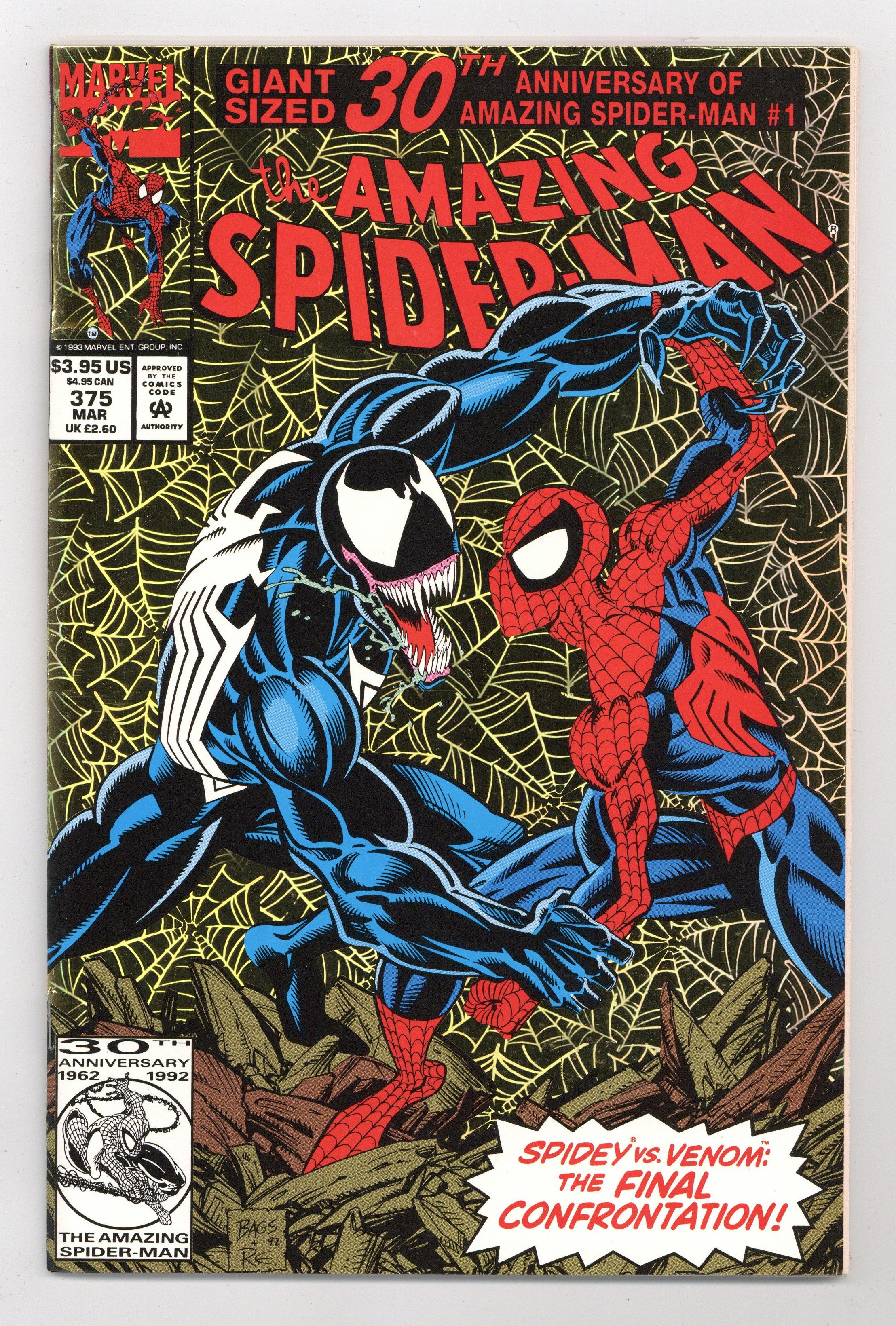 Tags: Marvel Legacy Numbering: Amazing Spider-Man (part 375), Print Run Statistics$14.00Direct Edition. 30th Anniversary issue of Amazing Spiderman #1. "The Bride of Venom" Part 2 of 2. Script by David Michelinie. Pencils by Mark Bagley. Inks by Randy Emberlin. Gold foil holografix cover by Mark Bagley and Randy Emberlin. Inside an abandoned Brooklyn amusement park, the Lethal Protector holds Richard and Mary Parker captive! The disturbed Venom thinks he's just doing what's best for Peter's parents! But that's not going to work! No way, no how! So, the wall-crawler heads to the park knowing a fierce fight awaits! However, the web-slinger may have help this time from a very unlikely source... Eddie Brock's ex-wife! Wow, will there be a family reunion atop the Ferris wheel? Or perhaps a funeral beneath it? One way or another, the Amazing Spider-Man and Venom battle for the last time! Cameo appearances by Silver Sable, Battlestar, Mary Jane Watson, and J. Jonah Jameson. Second story: "True Friends!" Script by Tom DeFalco. Pencils by Patrick Olliffee. Inks by Mark McKenna. Aware of what the Human Torch did to Empire State University, Spider-Man vows to bring his friend to justice. Cameo appearance by Silver Sable. Plot crosses over with Fantastic Four 373 & 374. Third story: "The Monster Within" Script by Eric Fein. Art by Dan Panosian. JJJ tries to get his son, John Jameson, started in the field of journalism. Fourth story: "Echoes..." Script by Terry Kavanagh. Pencils by Aaron Lopresti. Inks by Don Hudson. The Chameleon visits the grave of Kraven the Hunter. (Notes: Venom appears next in the first issue of his Lethal Protector (1993) series. The letters page includes a statement of ownership: average print run 660,958. average paid circulation 544,900.) 68 pages. Cover price $3.95.
