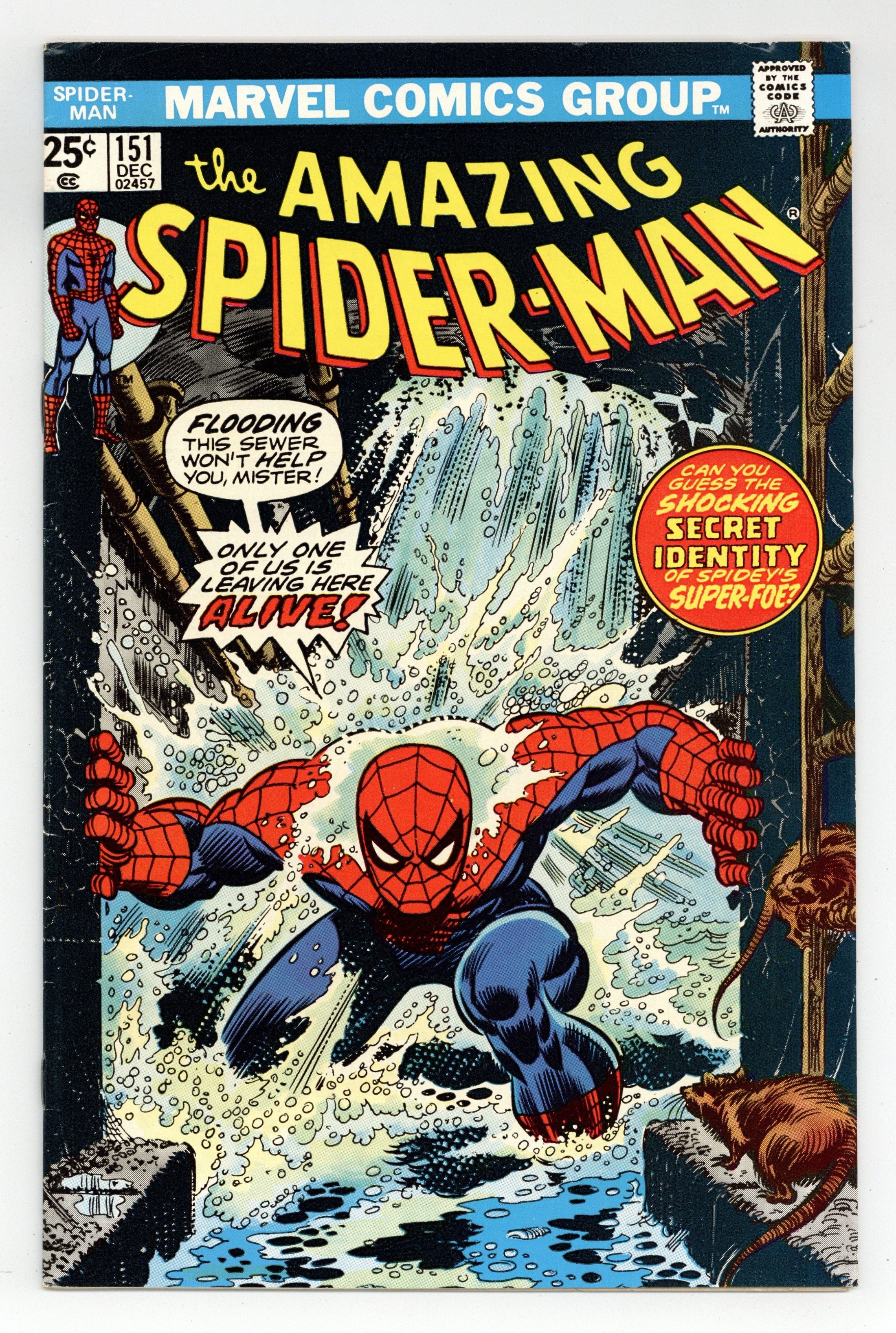 Tags: Marvel Legacy Numbering: Amazing Spider-Man (part 151), Spider-Man Clone Saga (part 00L)$36.00"Skirmish Beneath the Streets!" Part 1 of 2. Script by Len Wein. Pencils by Ross Andru. Inks by John Romita Sr., Mike Esposito, Frank Giacoia, and Dave Hunt (backgrounds). Cover by John Romita Sr. One of the best Spider-Man covers of the bronze age kicks off a new era for the wondrous wall-crawler! And JJJ begins the fun by hosting a party in honor of Ned and Betty's engagement! The flattop curmudgeon is in rare form and about to make a speech when the lights suddenly go out! What happened to the NYC power grid? Maybe it was a shock(er) to the system! The web-slinger descends into the sewers to find out! Appearances by Mary Jane Watson, Flash Thompson, Harry Osborn, Betty Brant, Ned Leeds, J. Jonah Jameson, and Joe Robertson. (Notes: In this issue Spider-Man disposes of his clone's body at the Brooklyn incinerating plant before attending Jonah's party. Thus, ending the saga of the Spider-Clone. Or so Spidey and all his fans thought. The Shocker previously appeared in Amazing Spider-Man 72. The cover to this issue is a homage to the classic cover of Amazing Spider-Man 33. Len Wein begins his memorable two-and-a-half year run as the writer of the Amazing Spider-Man title. This story was reprinted in Marvel Tales 128.) 36 pages. Cover price $0.25.