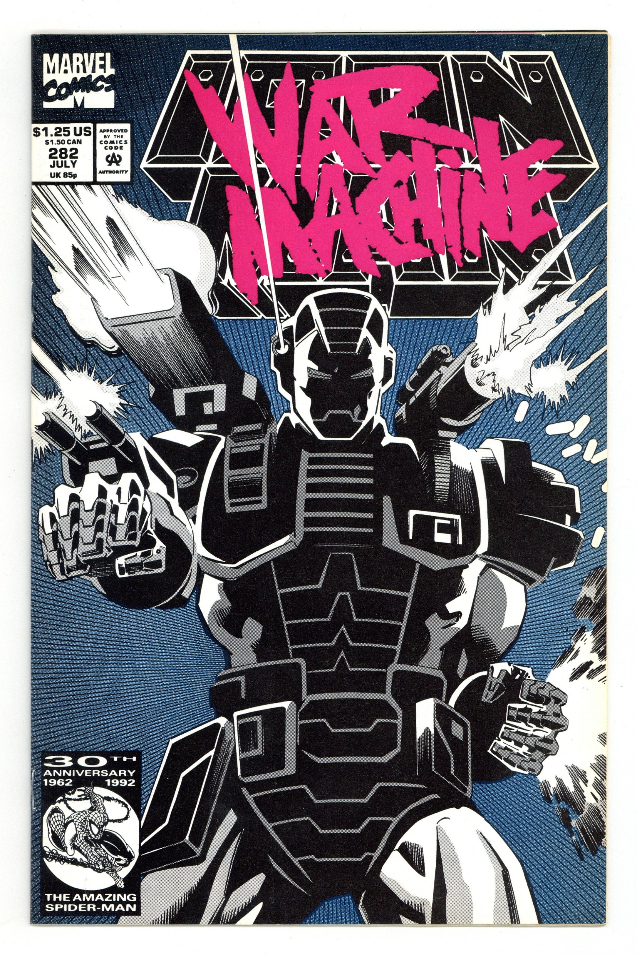 Tags: Marvel Legacy Numbering: Iron Man (part 282), Iron Man$80.00Direct Edition. "War Machine" Part 2 of 3. First (full) appearance of the War Machine armor. Script by Len Kaminski. Pencils by Kevin Hopgood. Inks by Bob Wiacek. Cover by Kevin Hopgood and Bob Wiacek. The Masters of Silence came to Stark Enterprises last issue looking for a fight! And now the trio is getting one in spades thanks to the War Machine armor! In a remarkable display of firepower; Tony Stark, clad in the new gray & white armor, trounces his would-be assassins! In the meantime, Jim Rhodes contacts SHIELD to learn who framed Stark Enterprises for the deadly accident in Japan! And it turns out to be someone the armored avenger knows very, very well! Cameo appearances by Justin Hammer and Nick Fury. (Note: The cover to issue 282 was reprinted as the cover to Iron Man (1968 1st series) Marvel Legends Reprint 281.) 32 pages. Cover price $1.25.