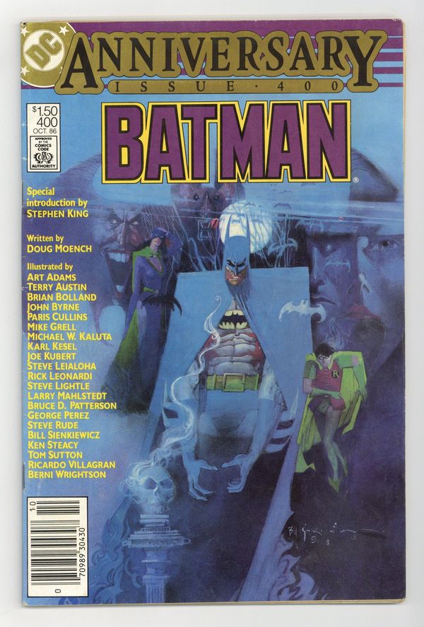 Tags: Batman$18.50Newsstand Edition. 2-page introduction by Stephen King. As Batman ponders the note 'Know Your Foes' sent to him as a warning, all of his foes are sprung from Arkham Asylum in "Resurrection Night!" Script by Doug Moench. Art by John Byrne (1 page), Steve Lightle & Bruce D. Patterson (6 pages), George Perez (4 pages), Paris Cullins & Larry Mahlstedt (3 pages), Bill Sienkiewicz (7 pages), Arthur Adams & Terry Austin (8 pages), Tom Sutton & Ricardo Villagran (6 pages), Steve Leialoha (3 pages), Joe Kubert (4 pages), Ken Steacy (3 pages), Rick Leonardi & Karl Kesel (6 pages), Brian Bolland (9 pages). Plus: pin-ups by Mike Grell, Michael W. Kaluta, Bernie Wrightson, Steve Rude. Cover by Bill Sienkiewicz. 68 Pages, Full Color. Cover price $1.50.