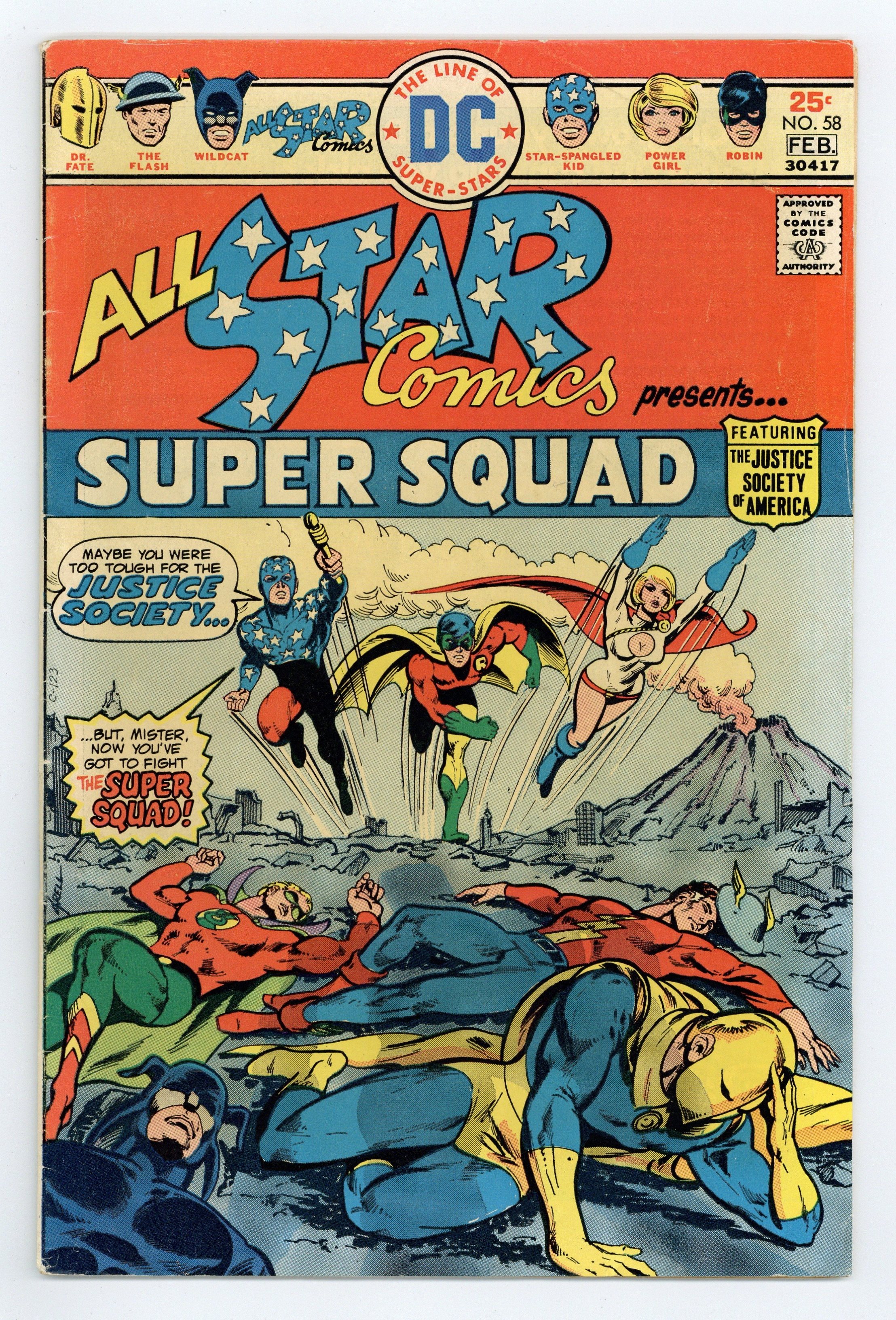 Starts Apr 4 1st appearance of Power Girl. Cover art by Mike Grell. The Super Squad! starring the All Star Super Squad, script by Gerry Conway, pencils by Ric Estrada, inks by Wally Wood; Power Girl describes the Super Squad as a strike force composed of the JSA and the three younger heroes--Robin, Power Girl, and Star-Spangled Kid. Letters from Roy Thomas and Jerry Bails. The Captive Commissioner Hostess ad starring Batman, pencils by Curt Swan, inks by Vince Colletta. 36 Pages, Full Color. Cover price $0.25.