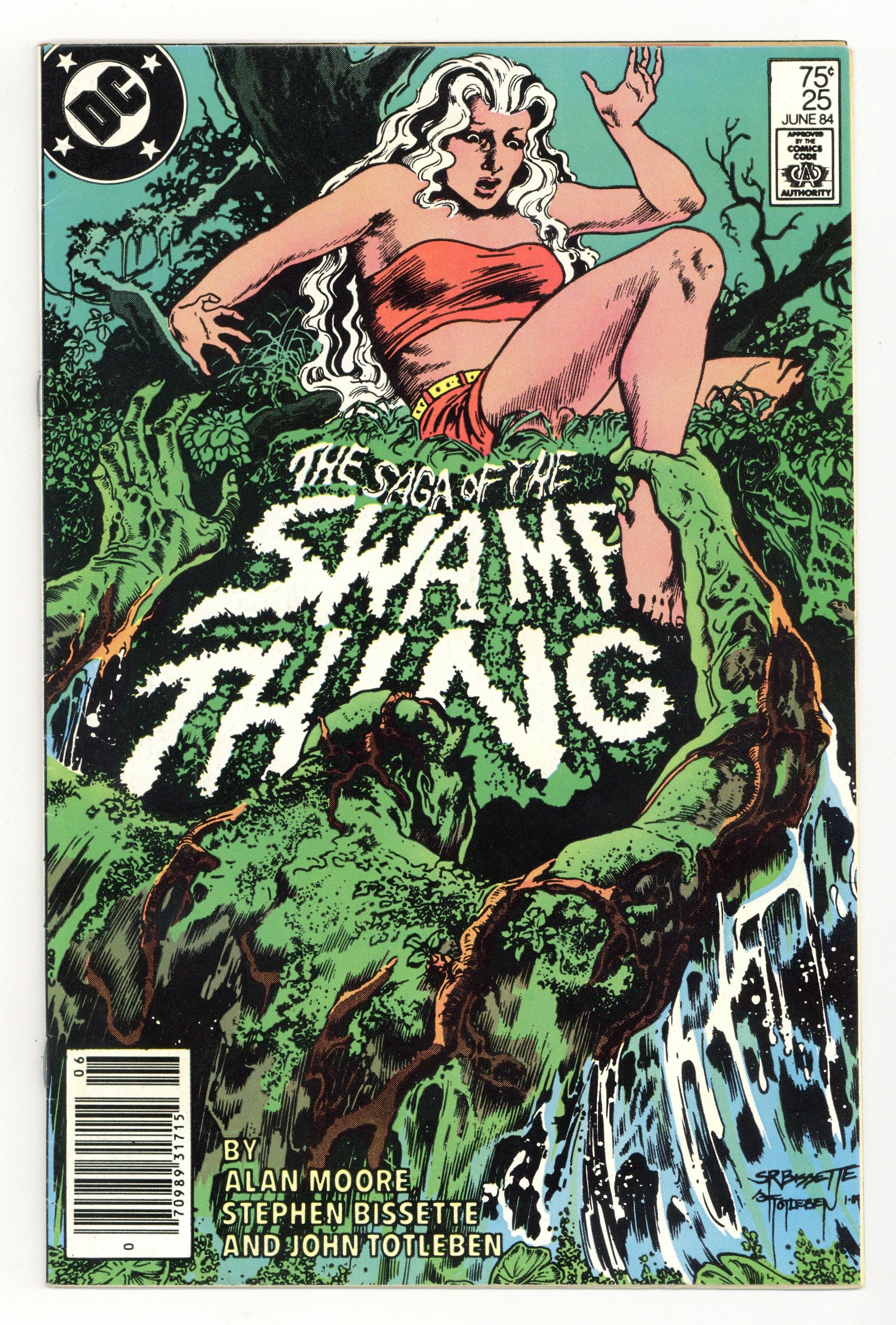 Newsstand Edition. Cover by Stephen R. Bissette and John Totleben. The Sleep of Reason..., script by Alan Moore, art by Stephen R. Bissette and John Totleben; Using a Ouija board, Chris and Jenny (Pauls parents) release the Monkey King, who adopts Paul as his master; Jason The Demon Blood goes to Baton Rouge; Abby gets a new job at Elysium Lawns; The Monkey King, getting stronger, is ready to attack again; John Constantine cameo. NOTE: See Swamp Thing (1982 2nd Series) #37 for Constantine's first full appearance. Part 1 of 3. 36 pgs., full color. $0.75. Cover price $0.75.