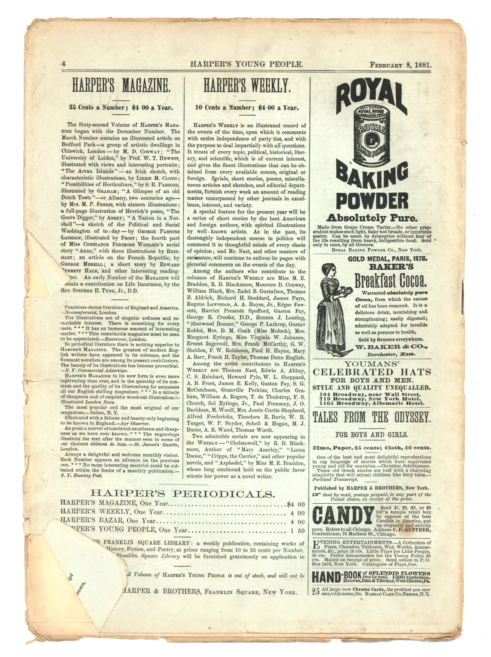 Published Feb 1881 by Harper & Brothers Publish.$16.00- Water damage: Slight.