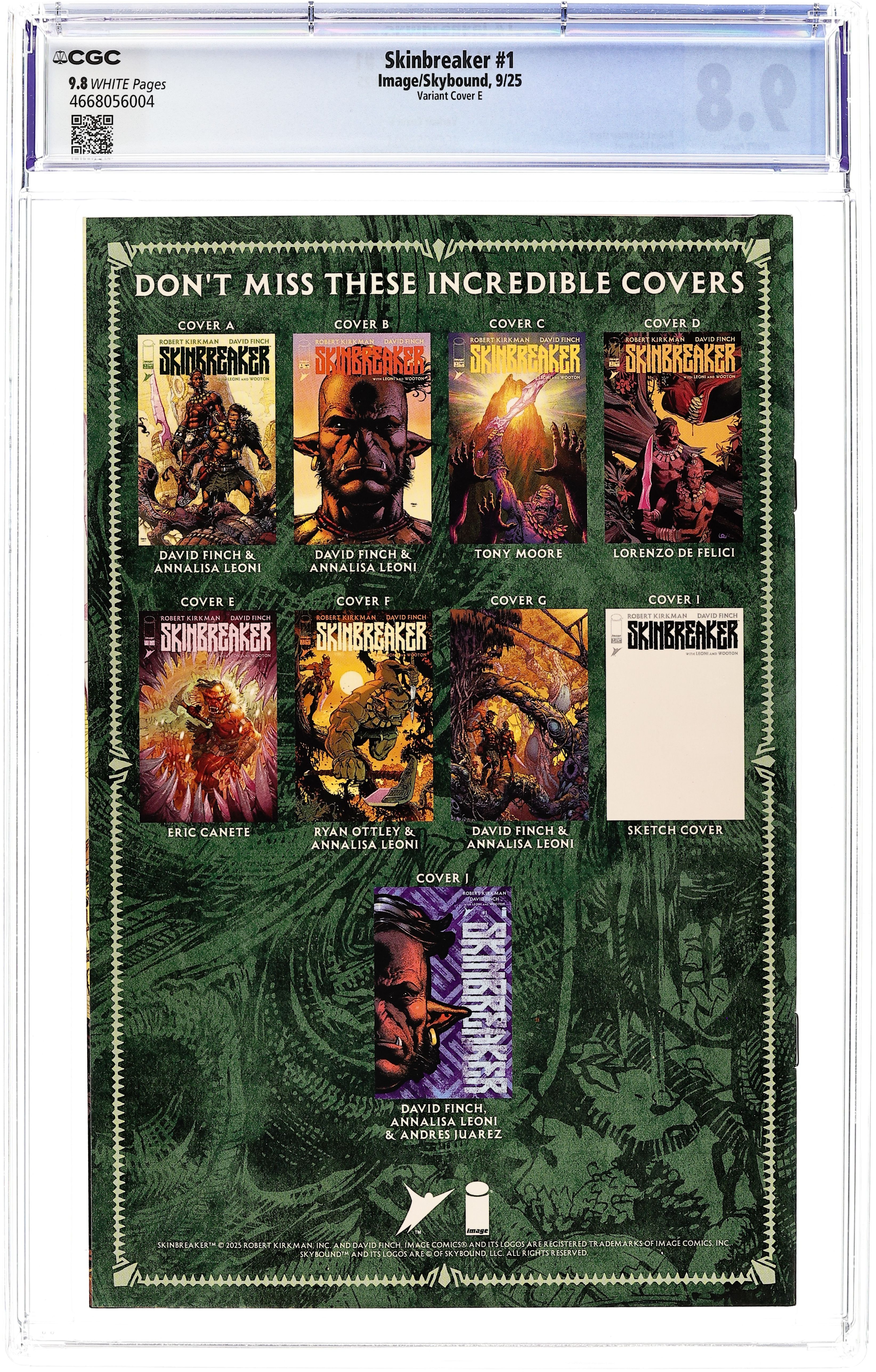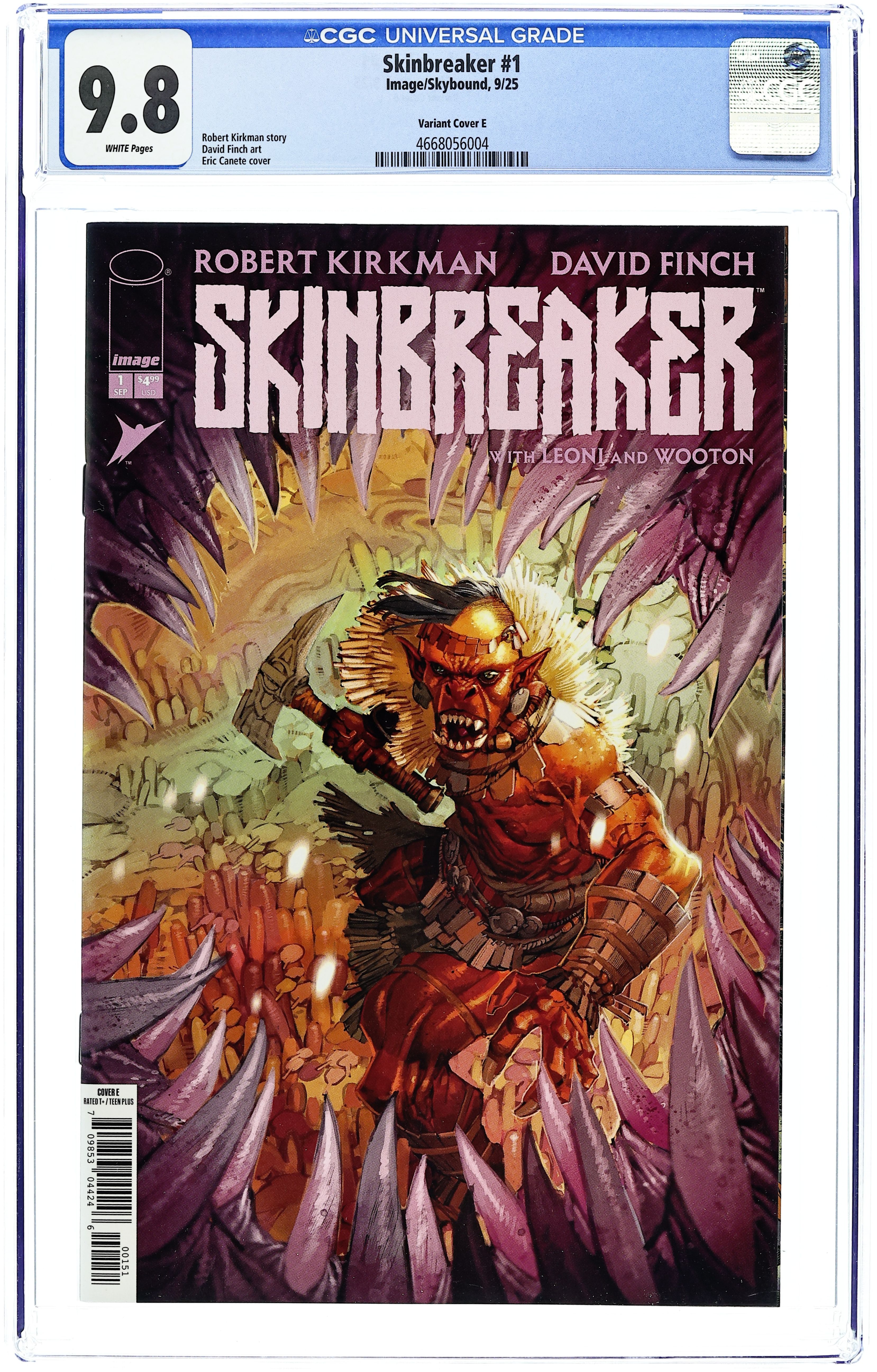 Limited 1 for 50 Retailer Incentive Variant Cover. Written by Robert Kirkman. Art by David Finch, Annalisa Leoni. Cover by Eric Canete. SERIES PREMIERE  FOR FANS OF INVINCIBLE UNIVERSE: BATTLE BEAST COMES YOUR NEW FAVORITE SERIES! ** The dream team of ROBERT KIRKMAN** (THE WALKING DEAD_, _INVINCIBLE) and superstar artist DAVID FINCH (Batman, New Avengers) present a visionary action epic unlike anything youve ever seen.  Enor has led his tribe for many seasons, but his time as Chieftan is coming to an end. He wields the mighty SKINBREAKER, but at his age, he can barely lift it. Will Enors reluctant heir, Anok, take over before their world falls to ruin? As a bloody power struggle begins, an even bigger threat lurks in the darkness beyond their village.  SKINBREAKER tells the story of a people on the verge of collapse and their fight for survival as the many threats they face close in for the kill. 32 pages, full color. Rated T+ Cover price $4.99.