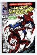 First Printing. Direct Edition. First (full) appearance of Carnage in "Savage Genesis!" Part 1 of 3. Script by David Michelinie. Pencils by Mark Bagley. Inks by Randy Emberlin. Cover by Mark Bagley and Randy Emberlin. Blood runs in the streets as a serial killer roams New York City! And as the web-slinger investigates the murders, he notices a very disturbing similarity to another killer's modus operandi! In a burned-out building in Brooklyn, the spectacular one comes face-to-face with his new homicidal foe...Carnage! Can the wall-crawler end Cletus Kasady's rampage in their very first encounter? Cameo appearances by Aunt May and Mary Jane Watson. Flashback cameo by Venom. (Note: This three-part story was reprinted in 2011 in the trade paperback: Spider-Man -- The Vengeance of Venom.) 36 pages, full color. $1.25 cover price. NOTE: Most of these were distributed with slight printer tears in the bottom edge of the cover. Cover price $1.25.