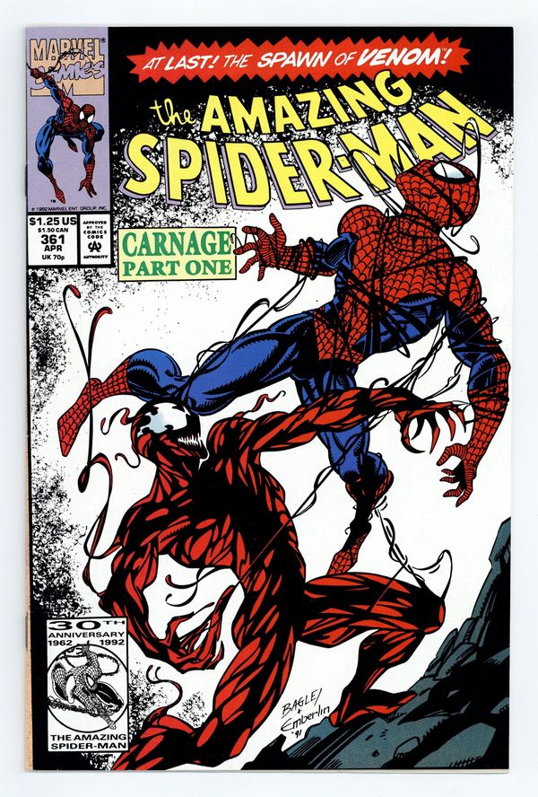 Tags: Marvel Legacy Numbering: Amazing Spider-Man (part 361), Spider-Man$75.00First Printing. Direct Edition. First (full) appearance of Carnage in "Savage Genesis!" Part 1 of 3. Script by David Michelinie. Pencils by Mark Bagley. Inks by Randy Emberlin. Cover by Mark Bagley and Randy Emberlin. Blood runs in the streets as a serial killer roams New York City! And as the web-slinger investigates the murders, he notices a very disturbing similarity to another killer's modus operandi! In a burned-out building in Brooklyn, the spectacular one comes face-to-face with his new homicidal foe...Carnage! Can the wall-crawler end Cletus Kasady's rampage in their very first encounter? Cameo appearances by Aunt May and Mary Jane Watson. Flashback cameo by Venom. (Note: This three-part story was reprinted in 2011 in the trade paperback: Spider-Man -- The Vengeance of Venom.) 36 pages, full color. $1.25 cover price. NOTE: Most of these were distributed with slight printer tears in the bottom edge of the cover. Cover price $1.25.