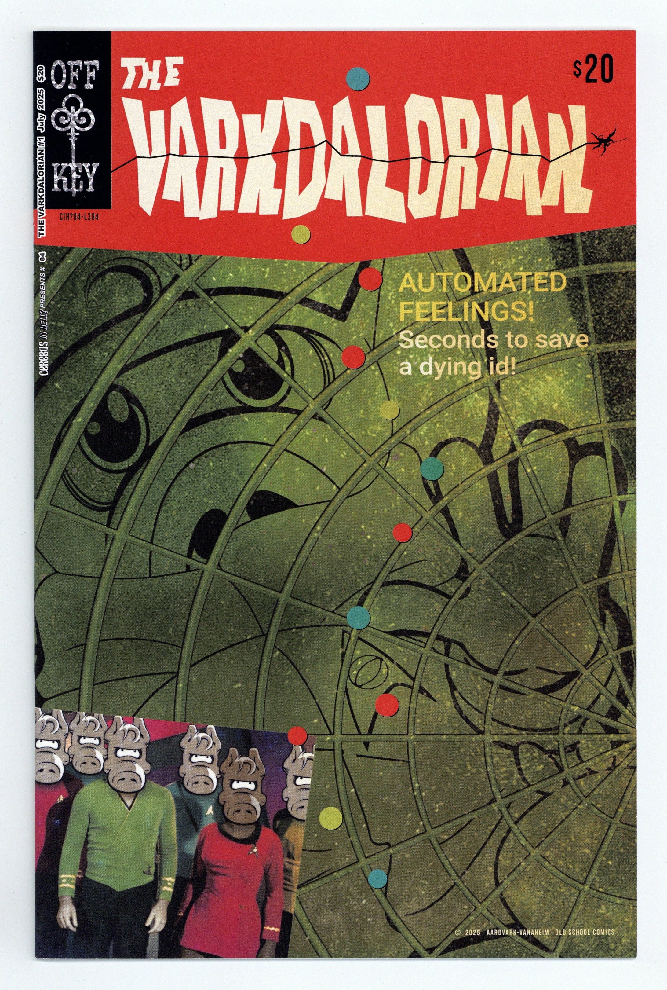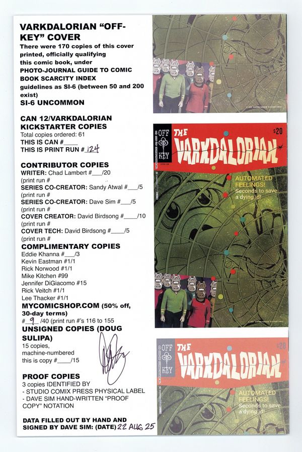 Published Aug 2025 by Aardvark-Vanaheim.$21.50Offered previously on Kickstarter, all copies signed and numbered by Dave Sim! Limited to ONLY 170 copies! Written by Chad Lambert. Art by Dave Sim. Cerebus in Hell? issue 84 raids the load pans of two mostly famous sci-fi franchises and one long forgotten, but still hazily remembered 1970s television program (everybody remembers the lovely ladies). SWKRPST, indeed. 24 pgs, B&W. Cover price $20.00.