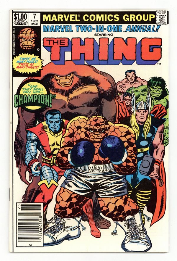 $19.75Newsstand Edition. "Champion!" Guest-starring Thor, Hulk, Sub-Mariner, Colossus, Sasquatch, Doc Samson, and Wonder Man. Cameos by the Fantastic Four, Avengers, and X-Men. Story by Tom DeFalco. Art by Ron Wilson, Camp Esposito, Giacoia, Dan Green, and Chic Stone. In arguably the best Thing story of all, a cosmic immortal known as the Champion, a being of nigh immeasurable strength whose existence is defined by physical contest, arrives on Earth and wishes to test his mettle against the mightiest heroes this planet has to offer. If they do not fight, this powerful being will destroy the Earth. After readily dispatching all contenders, the last man standing is Aunt Petunia's favorite nephew. But, can even the strongest member of the Fantastic Four hope to defeat an Elder of the Universe? 48 pages.