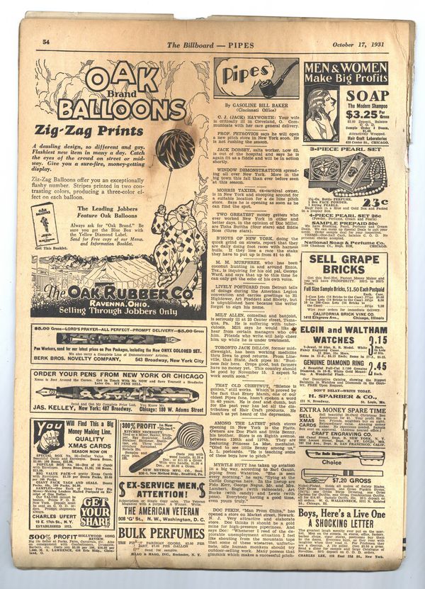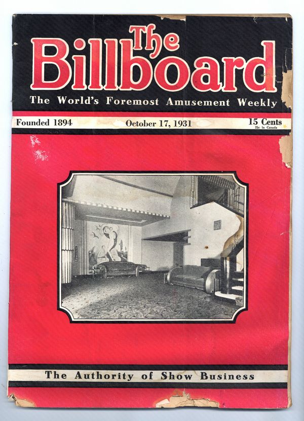 Published Oct 1931 by The Billboard Publishing Co..$13.75- Spine split 90%. No Back Cover. Incomplete, See Notes. Water damage: Moderate. Staple rust: Slight.