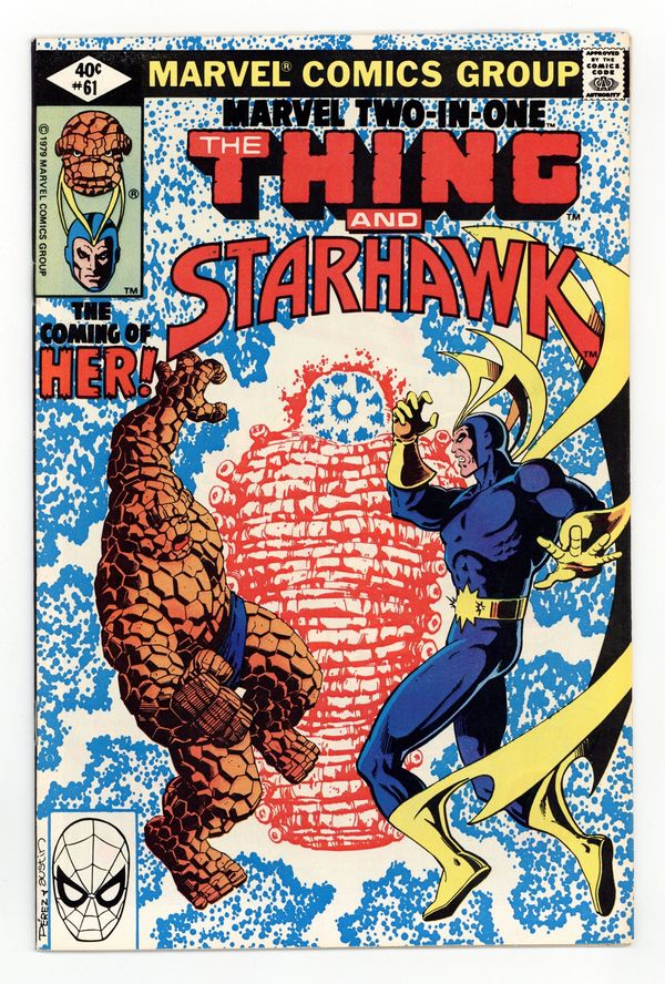 Direct Edition. Cover by George Pérez and Terry Austin. "The Coming of Her!" Part 1 of 3. Guest-starring Starhawk and Moondragon. Hulk, Doctor Strange, and Thanos cameos. Story by Mark Gruenwald. Art by Jerry Bingham and Gene Day. First came the mysterious and powerful being known as Him (Adam Warlock). Now, the being simply known as Her has arrived and she is seeking her counterpart. But he's dead, right? Includes a 1-page ad for the Parker Brothers Rom the Spaceknight electronic action figure that inspired the excellent comic series created by Bill Mantlo and Sal Buscema. Cover price $0.40.