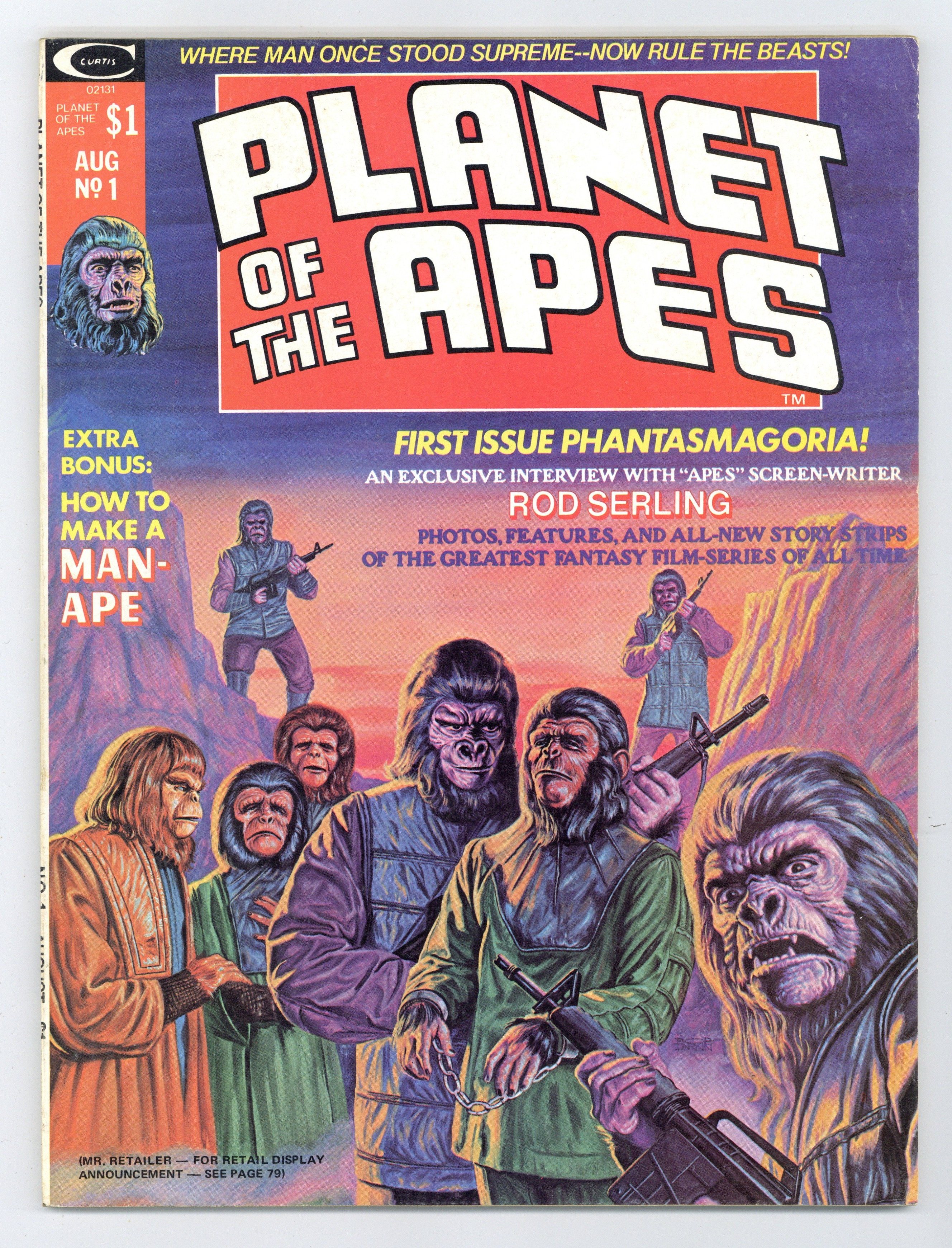 "Terror on the Planet of the Apes" (script by Doug Moench from an idea by Gerry Conway, art by Mike Ploog) and part one of an adaptation of the "Planet of the Apes" movie (script by Moench, pencils by George Tuska, inks by Mike Esposito). The rest of the issue consists of articles (with photos) and an interview with Rod Serling (who wrote the screenplay for the first Apes movie). Bob Larkin painted cover. Cover price $1.00.