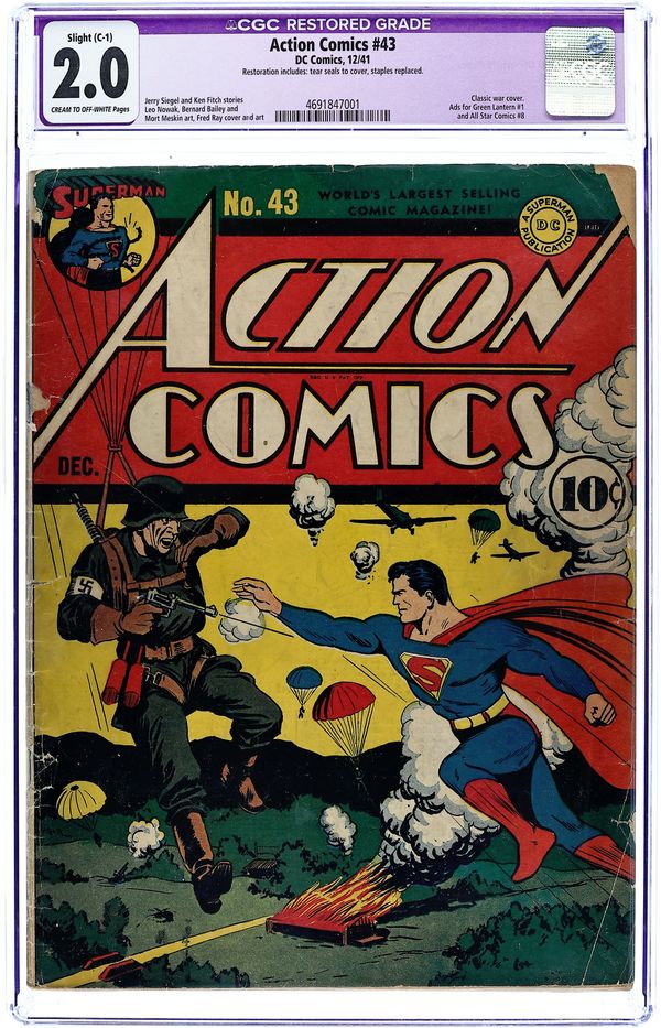 Cover art by Fred Ray. Superman story, script by Jerry Siegel, pencils by Leo Nowak (signed as Joe Shuster), inks by Ed Dobrotka. The Vigilante story, art by Mort Meskin. The Adventure of the Ancient Airplane starring Three Aces story, script by Gardner F. Fox, art by Chad Grothkopf. Mr. America story, script by Ken Fitch, art by Bernard Baily. Congo Bill story, art by Fred Ray. Zatara story, art by Joseph Sulman. 68 Pages, Full Color. $.10 Cover price $0.10.
