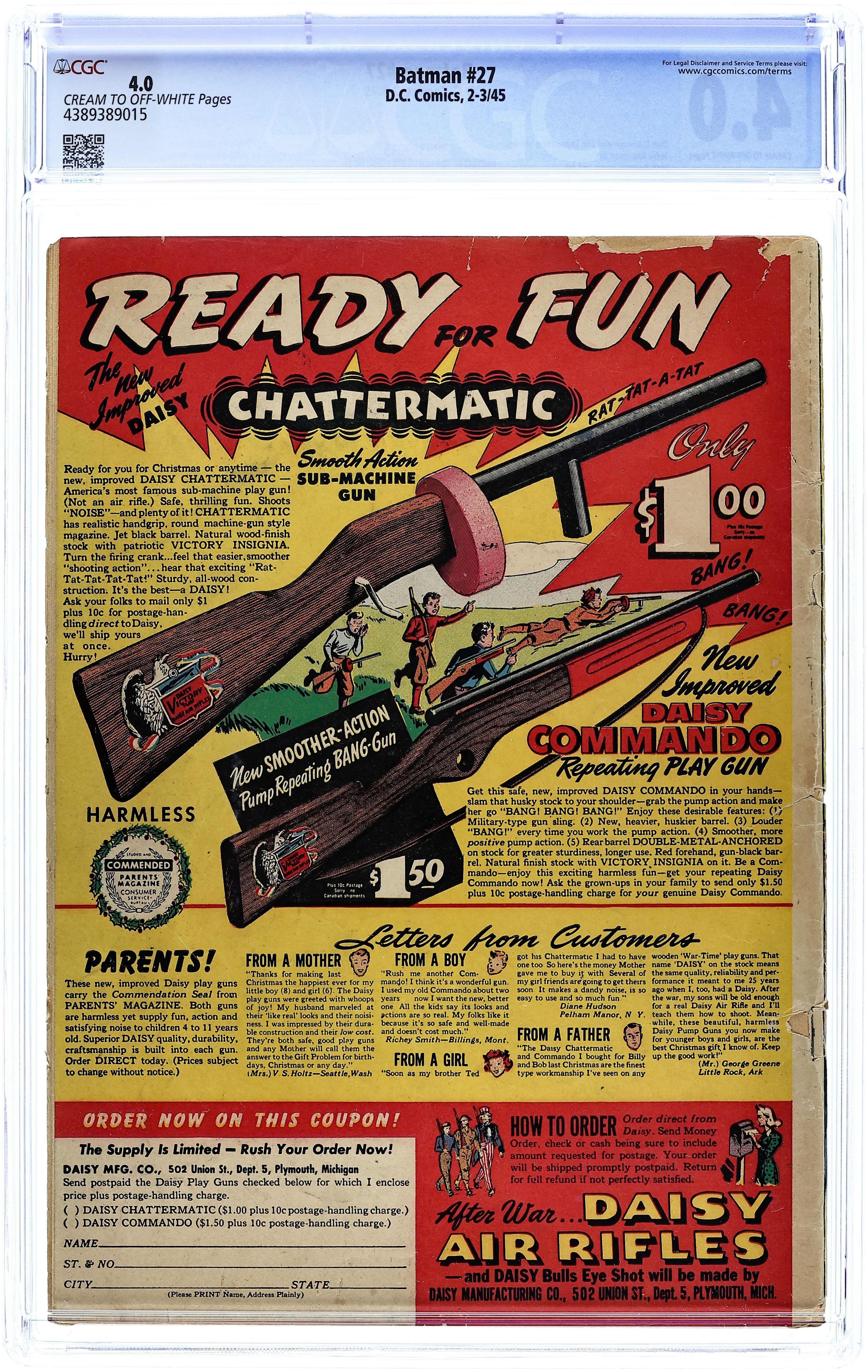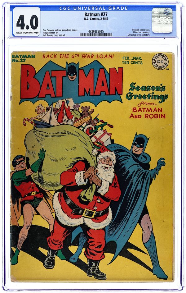 Cover by Jack Burnley. "The Penguin's Apprentice!", script by Don Cameron, pencils by Jack Burnley (as Bob Kane), inks by Jerry Robinson; Batman and Robin are puzzled when the Penguin begins stealing objects from people off the street, such as a handkerchief and a feather, unaware that he is attempting to train a young man in the fine art of crime. "Son of His Father" text story by Eddie Bell. "Son of His Father" text story by Eddie Bell. "The Pearl of Peril!", art by Jerry Robinson; When Alfred goes into a restaurant for dinner, he runs into a tramp who claims to have a pearl the size of an oyster. "Voyage Into Villainy!", script by Joe Samachson, pencils by Jack Burnley (as Bob Kane), inks by Jerry Robinson; The death of a wealthy, noted member of the Explorer's Club spurs on fellow member, Mr. Challoner, to track down clues in the Club's building to the deceased man's fortune. "A Christmas Peril!", script by Don Cameron, art by Jerry Robinson (as Bob Kane); Batman attempts to convince a very young "Scrooge" of the true meaning of Christmas. 52 Pages, Full Color. Cover price $0.10.
