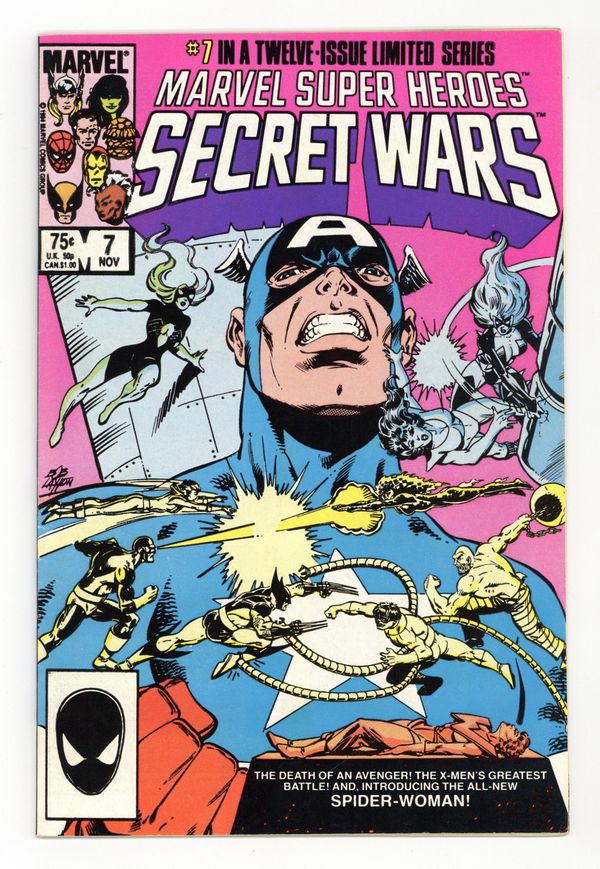 Tags: Secret Wars (1984) (part 7)$12.00Direct Edition. 1st appearance of Spider-Woman II (Julia Carpenter). "Berserker!" Part 7 of 12. Story by Jim Shooter. Art by Mike Zeck and John Beatty. Introducing Marvel's newest super-hero, Spider-Woman, a refugee from the displaced Denver, Colorado (NOTE: The Beyonder created Battleworld from pieces of hundreds of worlds from across the universe, Denver was one of those pieces). Plus, when the villains dump the Wasp's lifeless body into the heroes' camp, the Savage She Hulk decides to pay the bad guys a visit for some payback. But, has the emerald heroine finally bitten off more than she can chew? 36 pages, full color. Cover price $0.75.
