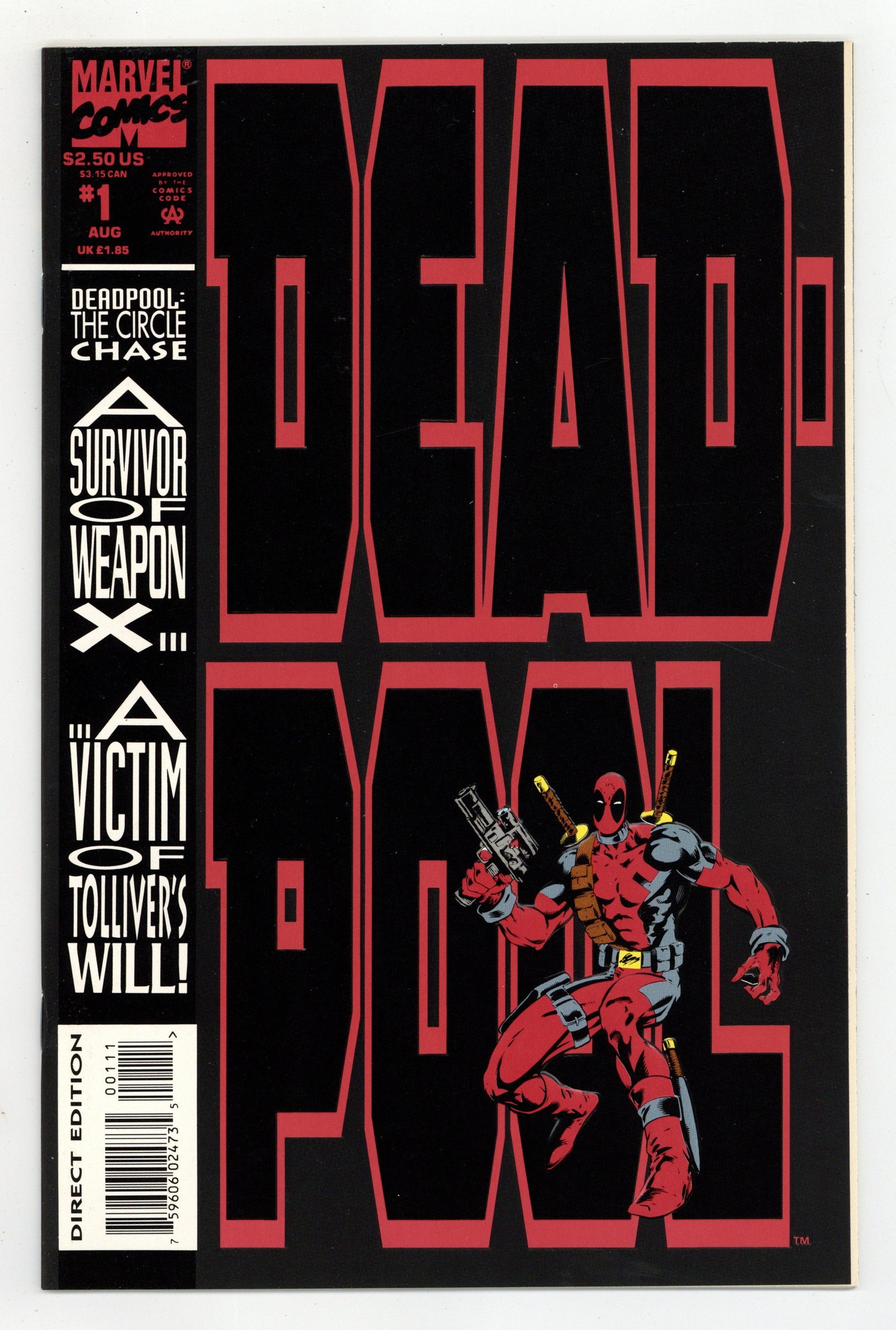 Direct Edition. The Circle Chase Round 1: Ducks in a Row - Written by Fabian Nicieza. Art and Cover by Joe Madureira and Mark Farmer. Sporting an outrageous cover -- an embossed figure of Deadpool is positioned leaning against a full cover sized embossed logo. This series pits Deadpool against Juggernaut, Black Tom Cassidy, Nyko and a wicked new villain, Slayback! 32 pages, full color. Cover price $2.50.