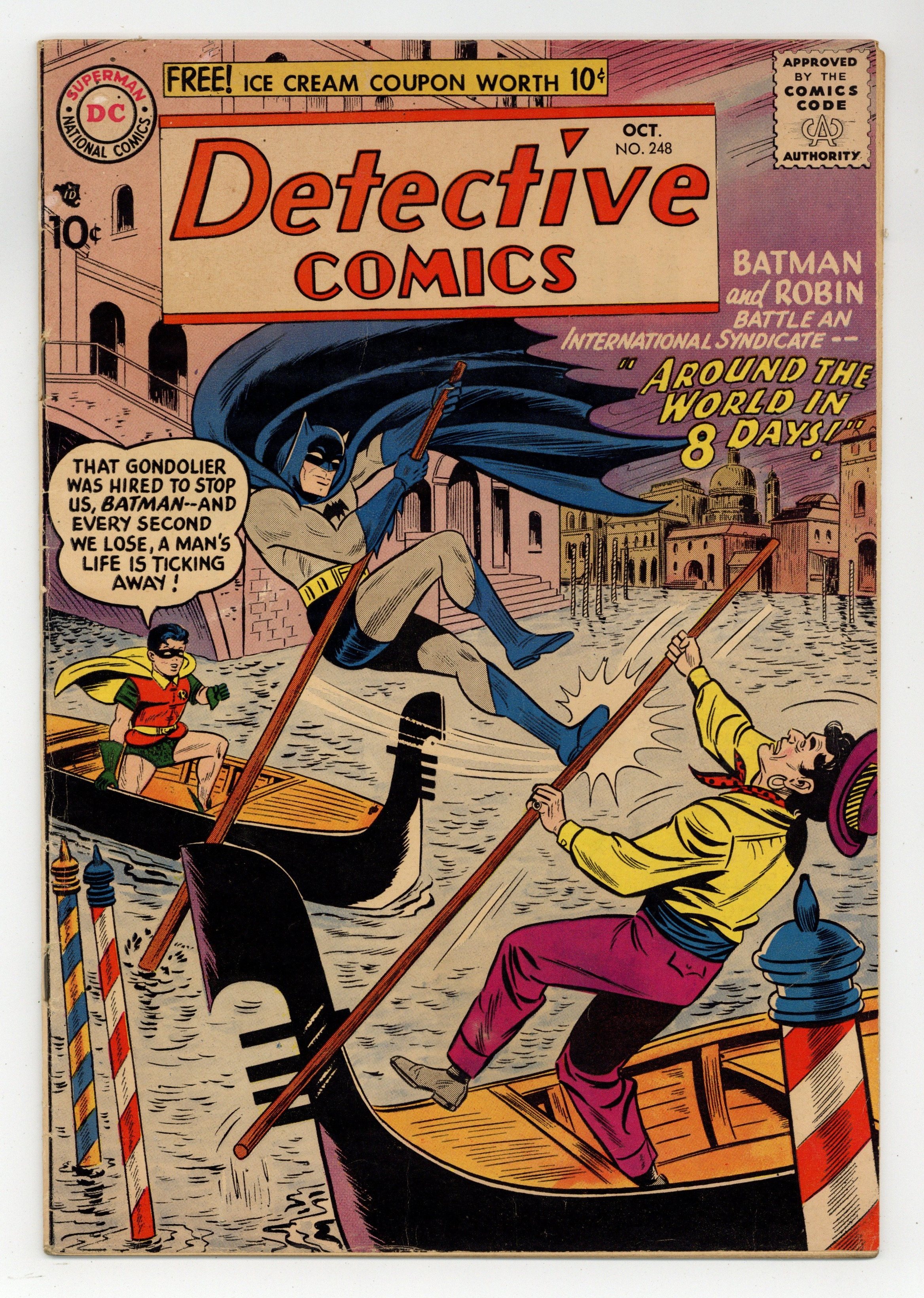 Cover art by Sheldon Moldoff. Around the World in 8 Days starring Batman and Robin, script by Bill Finger, pencils by Dick Sprang, inks by Charles Paris. How Not to Enjoy a Vacation! public service announcement, art by Ruben Moreira. The Fabulous Fabric starring Roy Raymond TV Detective, art by Ruben Moreira. Decision For a Lady Cop text story. Casey the Cop humor page by Henry Boltinoff. The Martian Without A Memory starring J'onn J'onzz Manhunter from Mars, art by Joe Certa. Warden Willis humor page by Henry Boltinoff. 36 pgs. $0.10. Cover price $0.10.