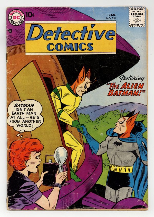 Cover art by Sheldon Moldoff. "The Alien Batman" starring Batman and Robin, pencils by Sheldon Moldoff, inks by Charles Paris; Vicki Vales snaps a picture of an alien dressed in a Batman costume and immediately jumps to a conclusion; Batman and Robin encounter villains Brand Ballard and Keener . Casey the Cop humor page by Henry Boltinoff. "The Human Parrot" starring Roy Raymond TV Detective, art by Ruben Moreira; Roy battles Kurudu. Warden Willis two-pager by Henry Boltinoff. Fatal Fingerprints article. "Alias Mr. Zero"starring John Jones Manhunter from Mars, script by Jack Miller, art by Joe Certa; Jones disguises himself as Mr. Zero to smoke out a gang chief; intro of bad guy Mr. Big . Wanted: A Teen-Age Code public service announcement, art by Ruben Moreira. 36 pgs., full color. Cover price $0.10.