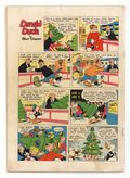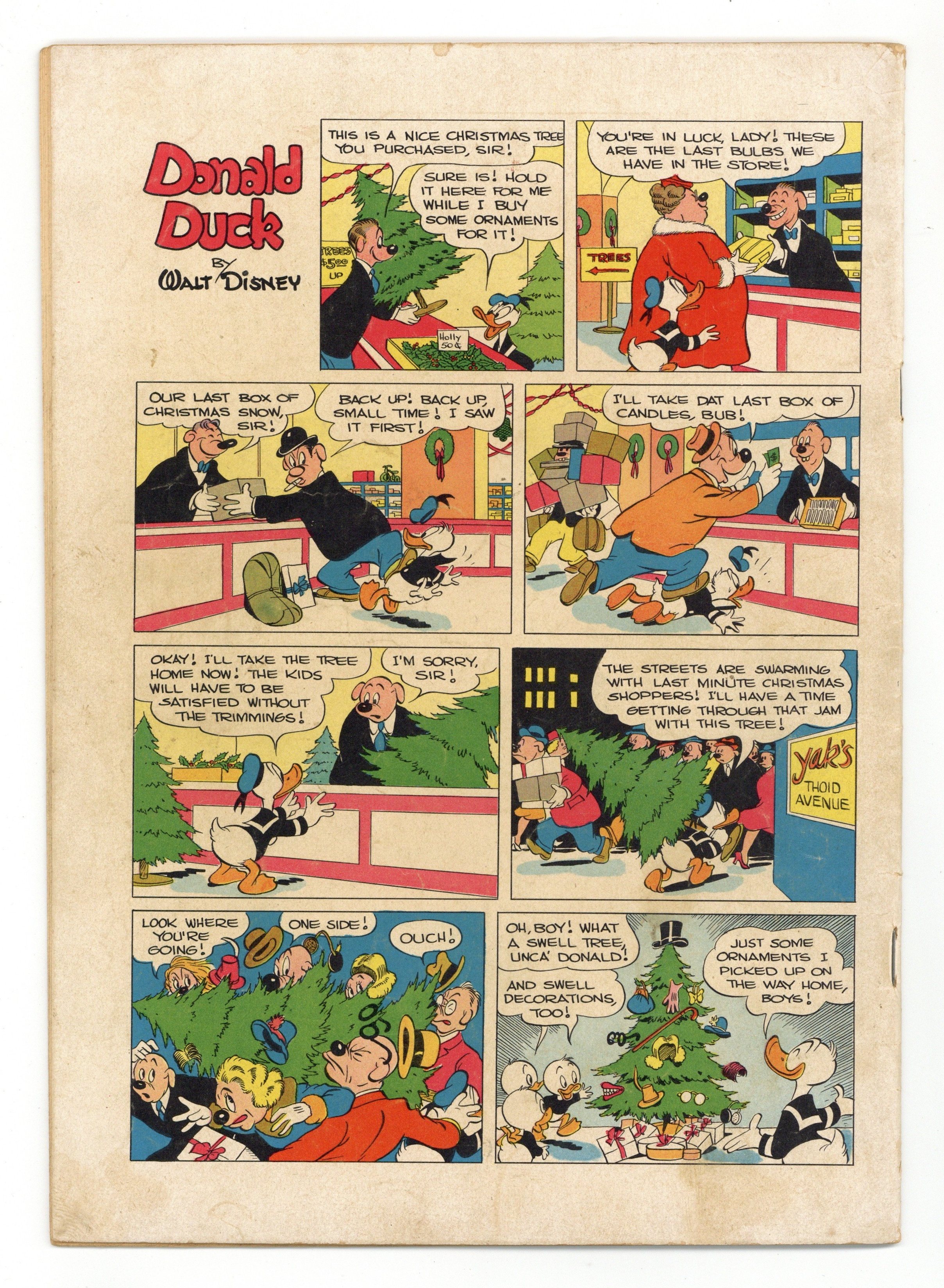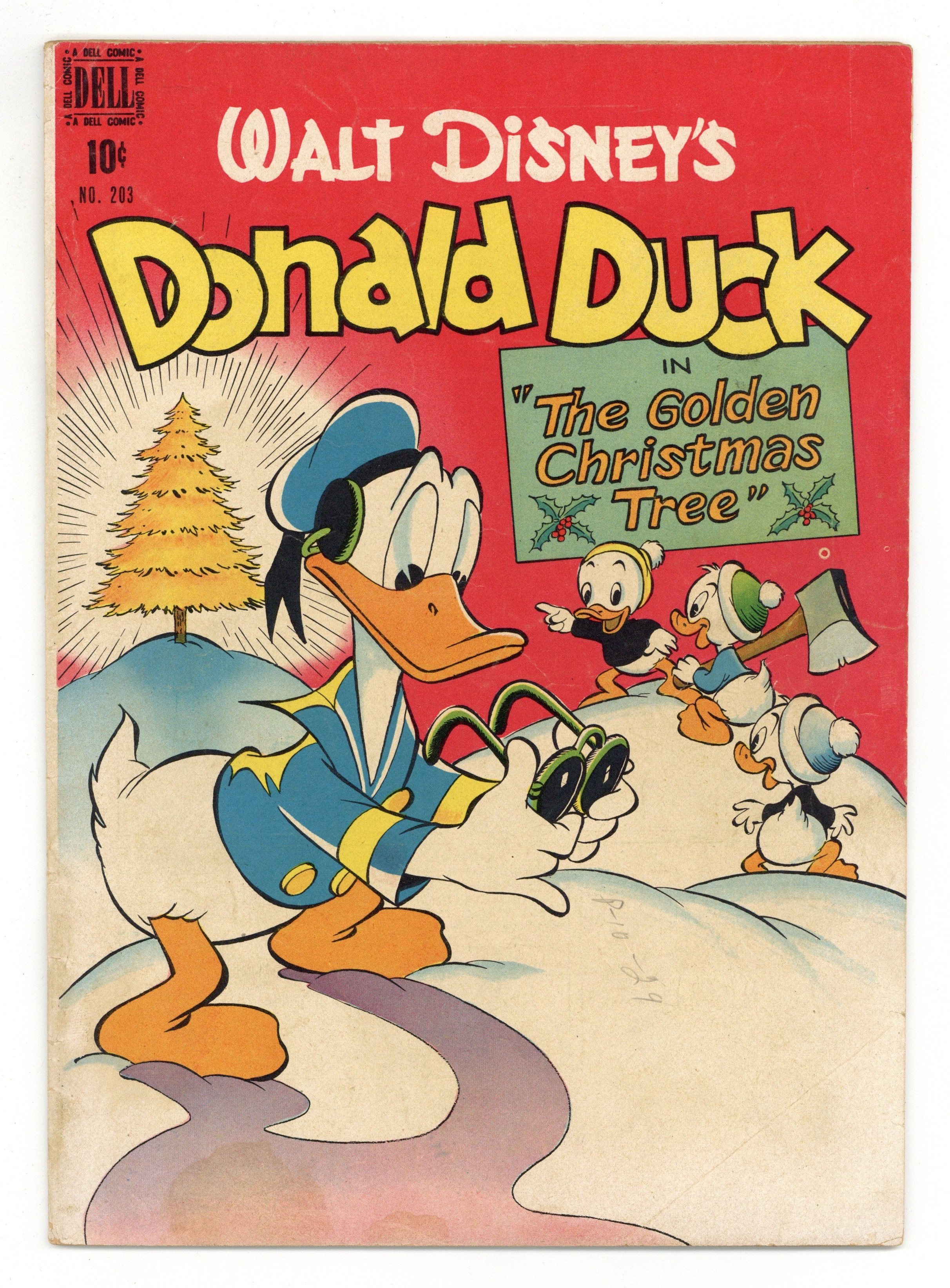 Indicia title is Walt Disney's DONALD DUCK in THE GOLDEN CHRISTMAS TREE, No. 203. The Golden Christmas Tree, art by Carl Barks; The nephews, disappointed in their wish for a golden Christmas tree, are lured into a trap by a witch who plans to use their tears in a magic potion that will destroy all the Christmas trees on earth. Special Delivery, script and art by Bill Wright; Santa sprains his ankle when he visits Mickey's house on Christmas Eve; Mickey and Goofy deliver the presents on the few remaining stops on Santa's list, but not without a number of accidents. The True Test one-page strip, script and art by Carl Barks; Donald tests toys to see how sturdy they are. Ornaments on the Way one-page strip, script and art by Carl Barks. 36 pages, full color. Cover price $0.10.