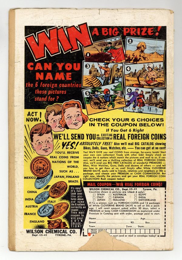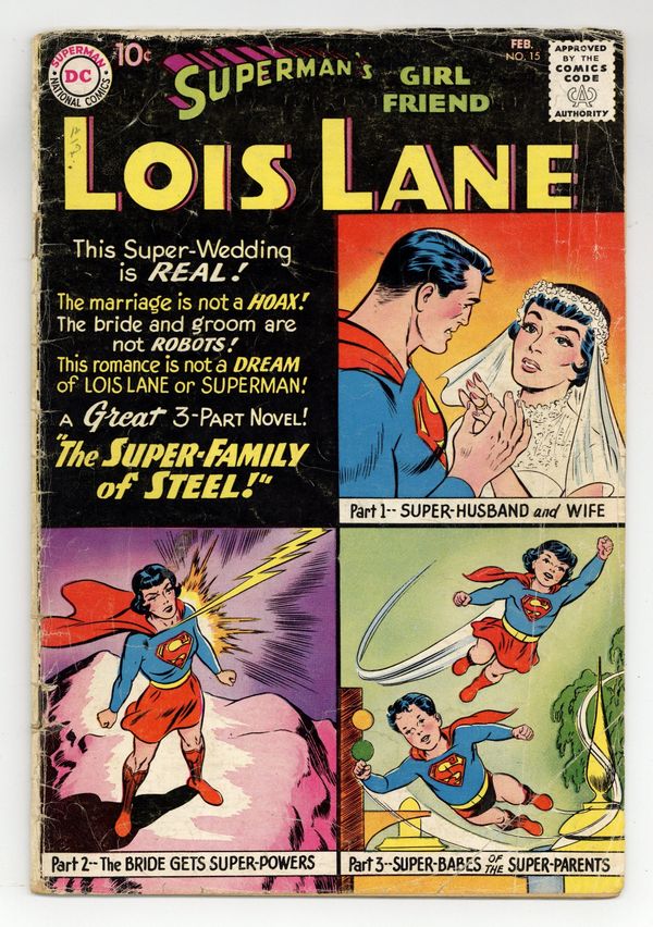 Cover pencils by Curt Swan, inks by Stan Kaye. The Super-Family of Steel! Part 1: Super-Husband and Wife!, script by Otto Binder, art by Kurt Schaffenberger; A girl who looks very much like Lois Lane meets a man who looks and acts very much like Superman and they get married by a native chief on a remote island. [The Super-Family of Steel!] Part II: The Bride Gets Super-Powers!, script by Otto Binder, art by Kurt Schaffenberger; a couple go on their honeymoon in space, then settle on Venus where they have twin children, after which the girl who looks like Lois gets superpowers. [The Super-Family of Steel!] Part III: The Secret of the Super-Family!; All is revealed and Van-Zee and Sylvia move into the bottle city of Kandor. 36 Pages, Full Color. Cover price $0.10.