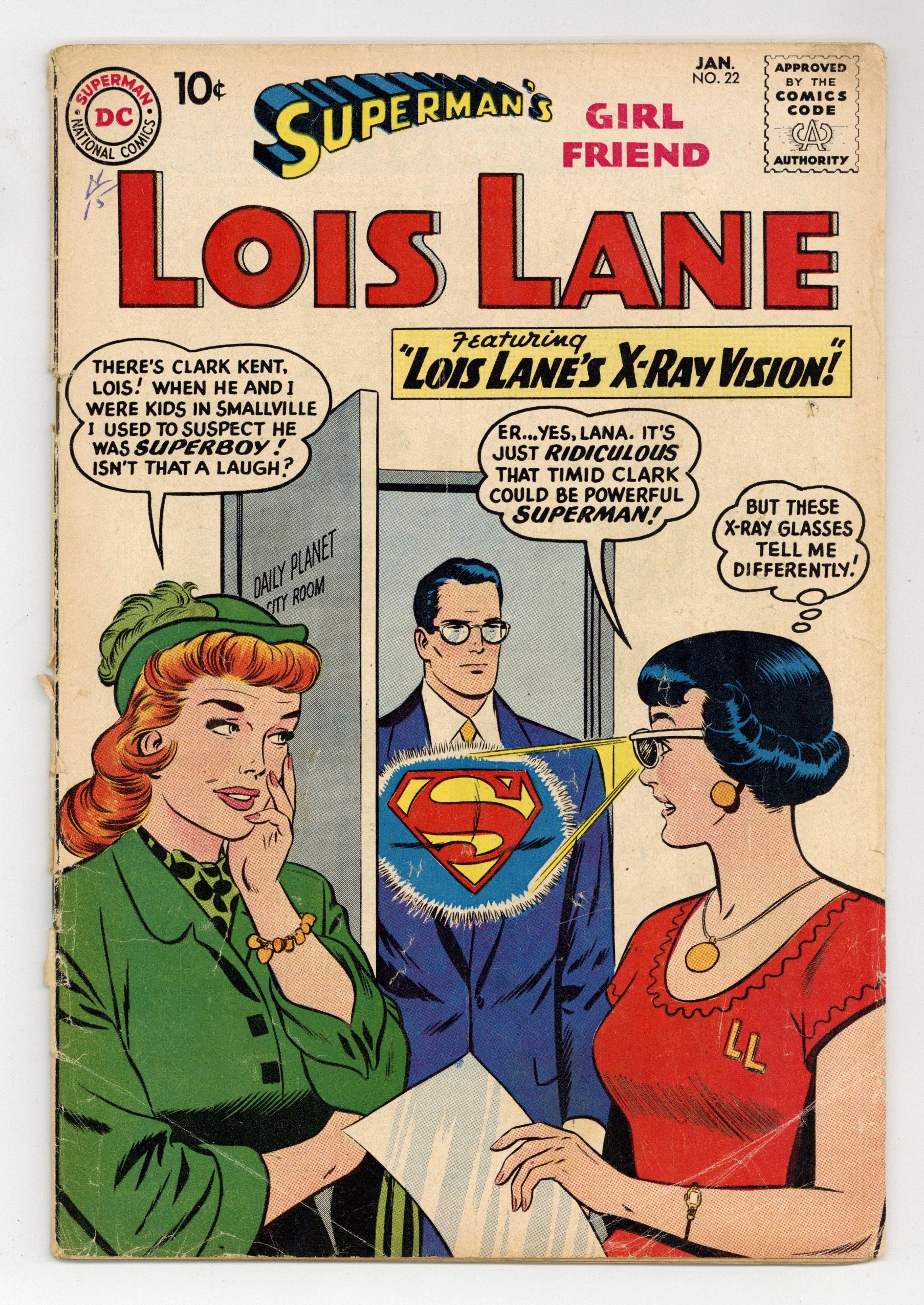 Cover pencils by Curt Swan, inks by Stan Kaye. The Day When Superman Proposed!, script by Jerry Siegel, art by Kurt Schaffenberger; After accidental exposure to Red Kryptonite Superman proposes to Lois Lane. Cora the Car Hop story by Henry Boltinoff. House ad for Superman Annual #2. Lois Lane's X-Ray Vision!, script by Robert Bernstein, art by Kurt Schaffenberger; An accident causes Lois' glasses to become X-Ray glasses. Sweetheart of Robin Hood!, art by Kurt Schaffenberger; Lois and Clark are in England covering the opening of the Robin Hood Museum when Lois scratches herself on a poisoned arrow, causing her to faint and dream of living in Robin Hood's time. 36 Pages, Full Color. Cover price $0.10.