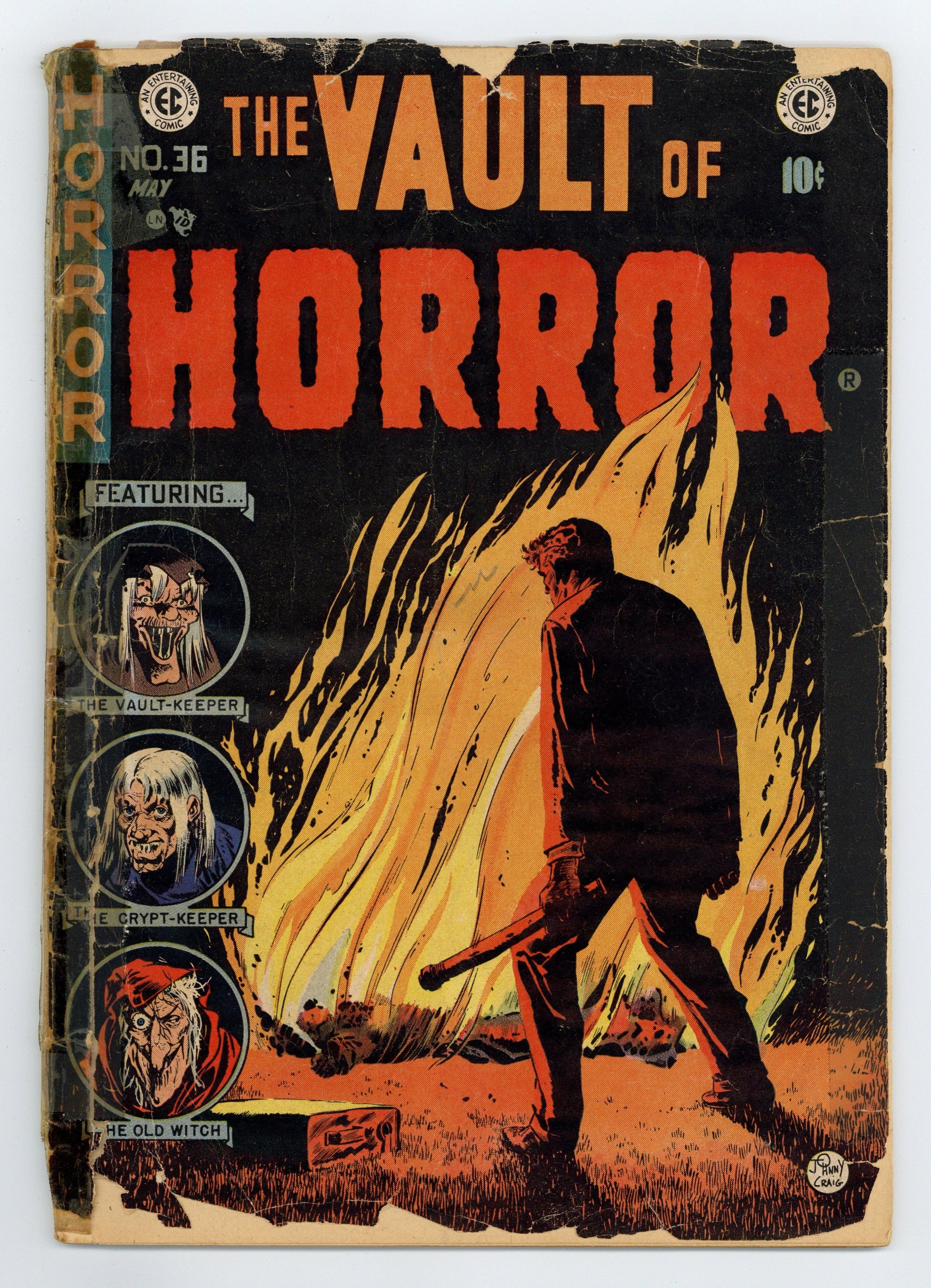 Cover by Johnny Craig. Ad for Panic. "Twin Bill!", script and art by Johnny Craig; Larry stood there in the dark, sweating profusely, waiting for them to come: his wife and her lover. He remembered the night he caught them in each other's arms... how he made them take shovels and forced them to dig their grave. "Witch Witch's Witch!", script by Johnny Craig, art by Jack Davis; Eric came home to Blumstedt with his new wife... who was not the girl to whom he had been betrothed since childhood. "Cooler" text story. "Pipe Dream," script by Johnny Craig, art by Bernie Krigstein; Chen begins his tale while frequenting an opium den, a place where he can have drug-induced dreams that give him power and importance. "Two-Timed!", art by Graham Ingels (as Ghastly); It was 1900 and little Dickie lay in his bed until he heard a sound he thought was his Mom and Dad returning home; Instead it came from outside, and he followed the sound until he saw a man viciously beating a woman to death. 36 pgs., full color. $0.10. Cover price $0.10.